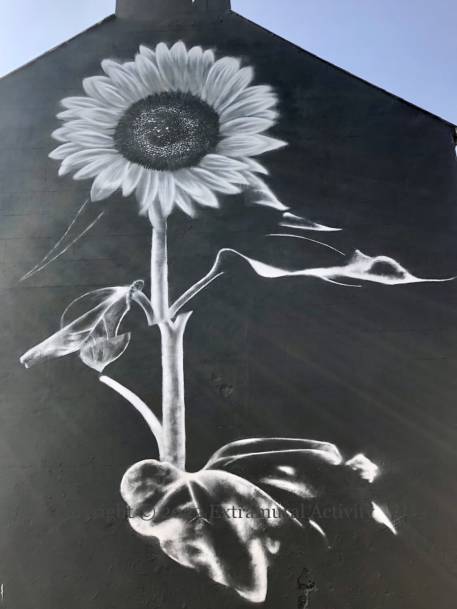 A Ukrainian woman in Heniches’k (just north of Crimea) (tw | with subtitles) became famous for berating an invading Russian soldier with the words “Take these seeds and put them in your pockets so at least sunflowers will grow here when you all die here.” Ukraine is the world’s largest producer of sunflower oil (WP) and since the Russian invasion began on February 24th, prices have increased – so far – by about 70% (Money Control), sending countries (especially India – Reuters | Bloomberg) and companies around the globe scrambling for alternatives, such as the replacement of sunflower oil by rapeseed oil in the making of crisps in Ireland (The Journal). The sunflower has become a symbol of solidarity with Ukraine, along with the Ukrainian flag. This giant sunflower was painted by emic (web | tw | ig) in Harrow Street.