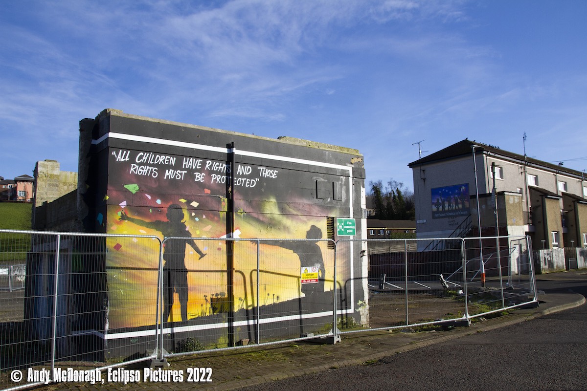 The Bogside Inn and bogside shops have been razed and “exciting plans” made for a new development (Derry Journal). All that remains at present is the electrical station near Durrow Park, and all that remains of the murals along Meenan Square is the final panel shown above: “All children have rights and these rights must be protected.”