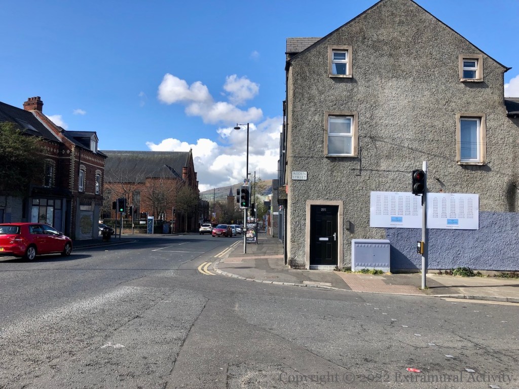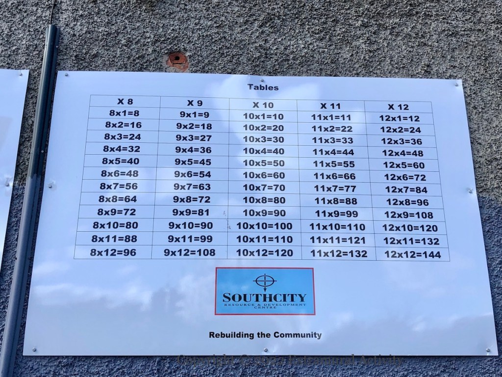 Southcity Resource & Development Centre (Fb) provides (among many other services) a ‘homework club’ on Tuesday afternoons. They have put up the times tables in four locations around the Village that will encourage kids walking to and from school to practice their maths. The set shown here is in Roden Street; the others are in Lemberg Street, Nubia Street, and Tavanagh Street – below this UVF hooded gunman.