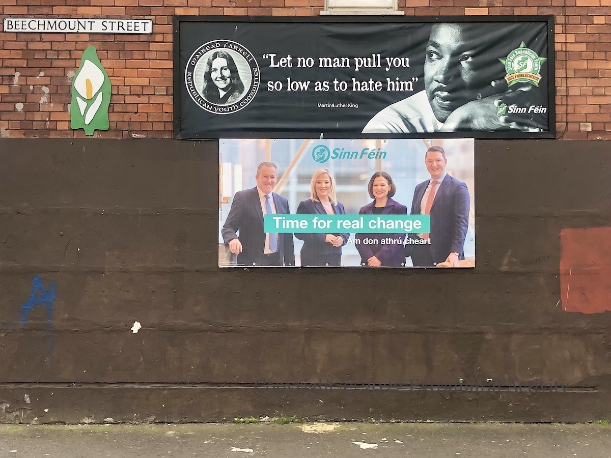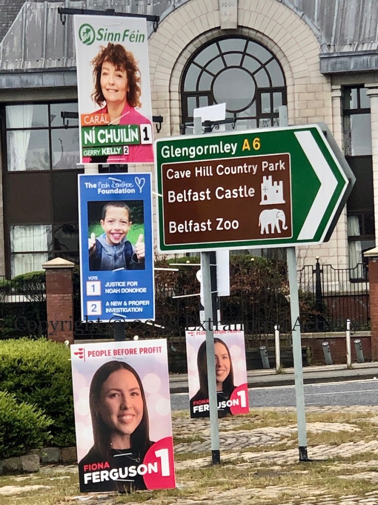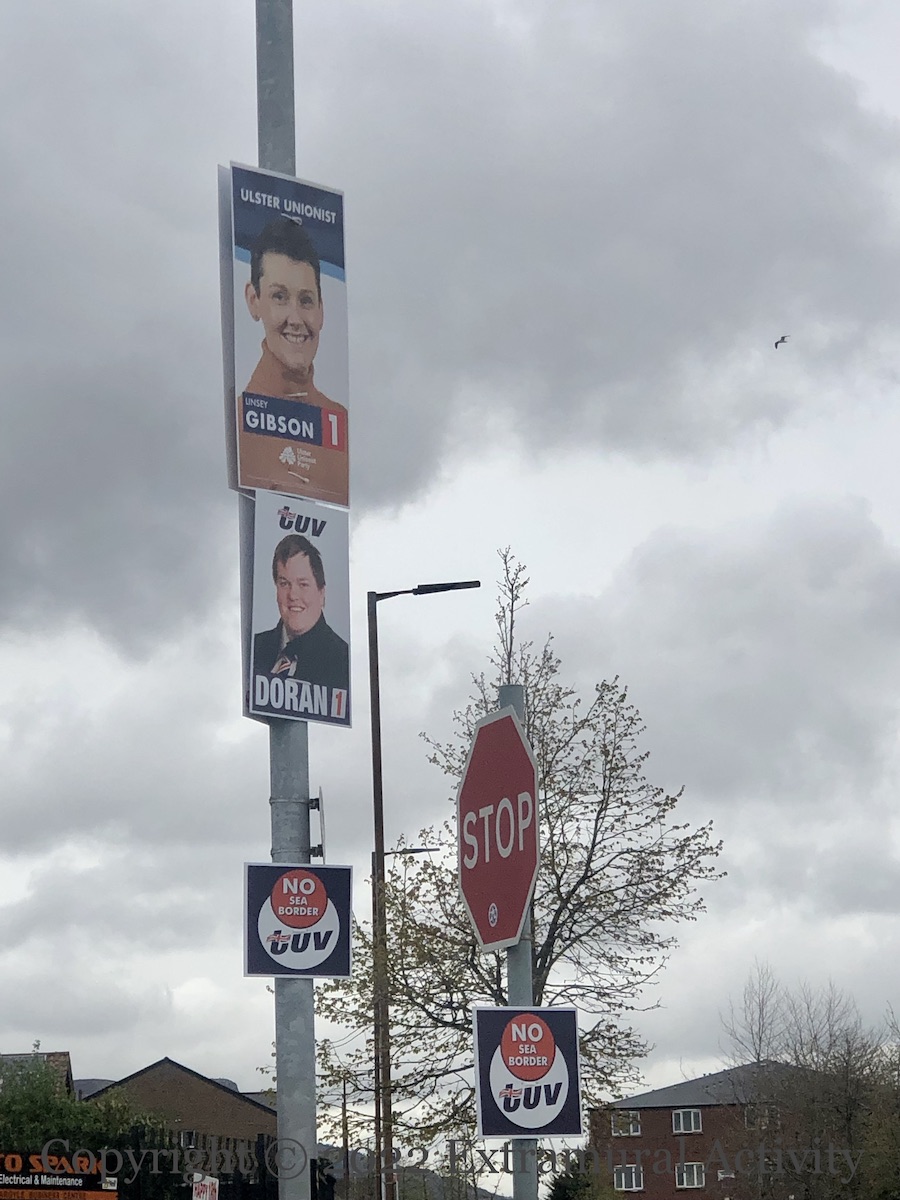 Today is the last day to register to vote in the May 5th Assembly election. You can register on-line at gov.uk. Currently, 1.4 million people are registered in Northern Ireland (BBC). As today’s images make clear, the poles of Belfast are already cluttered with placards for the various candidates, as well as the salient issues, such as the “sea border” and the death of Noah Donohoe.