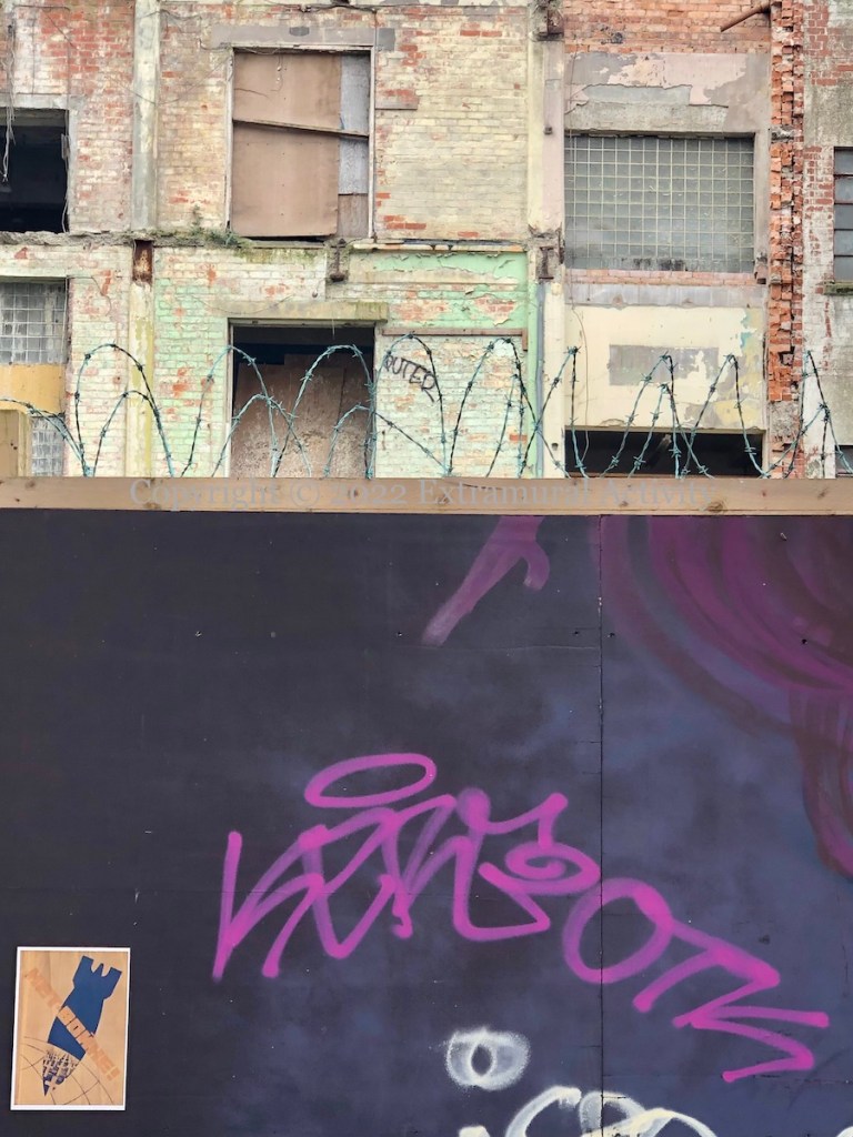 In Belfast, Tadeusz Tradewski’s 1952 poster “Nie!” [Polish for “No!”] (MOMA) has been updated for the current war in Ukraine – in the shadow of the bomb (which has a “Z” on the tail) is not a city but a graveyard, the graveyard of the planet. (See previously: Stop War)
