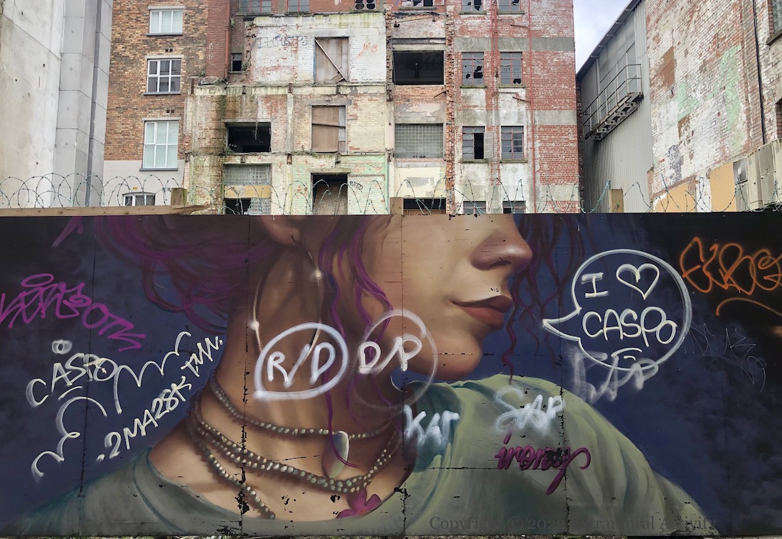 By Leo Boyd (ig) in Warehouse Lane, Belfast, to the side of a 2020 piece by Irony.