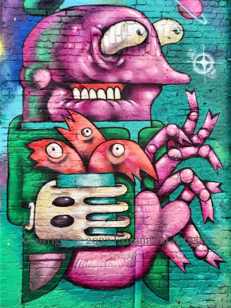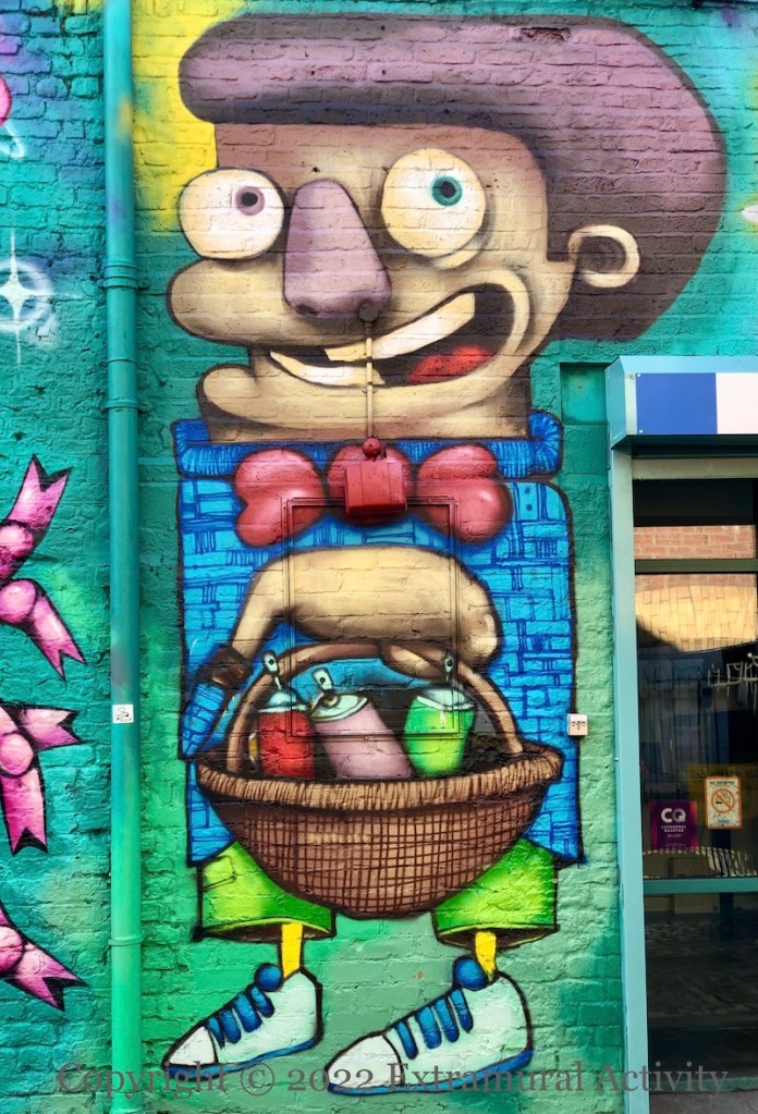 This time last year (2021-04) KVLR (ig | tw | Fb) revamped the mural on the front of the Gordon Street premises with two new characters (above and directly below) and substantial changes to the third (final image). (For the previous version, see Circus Fools.)