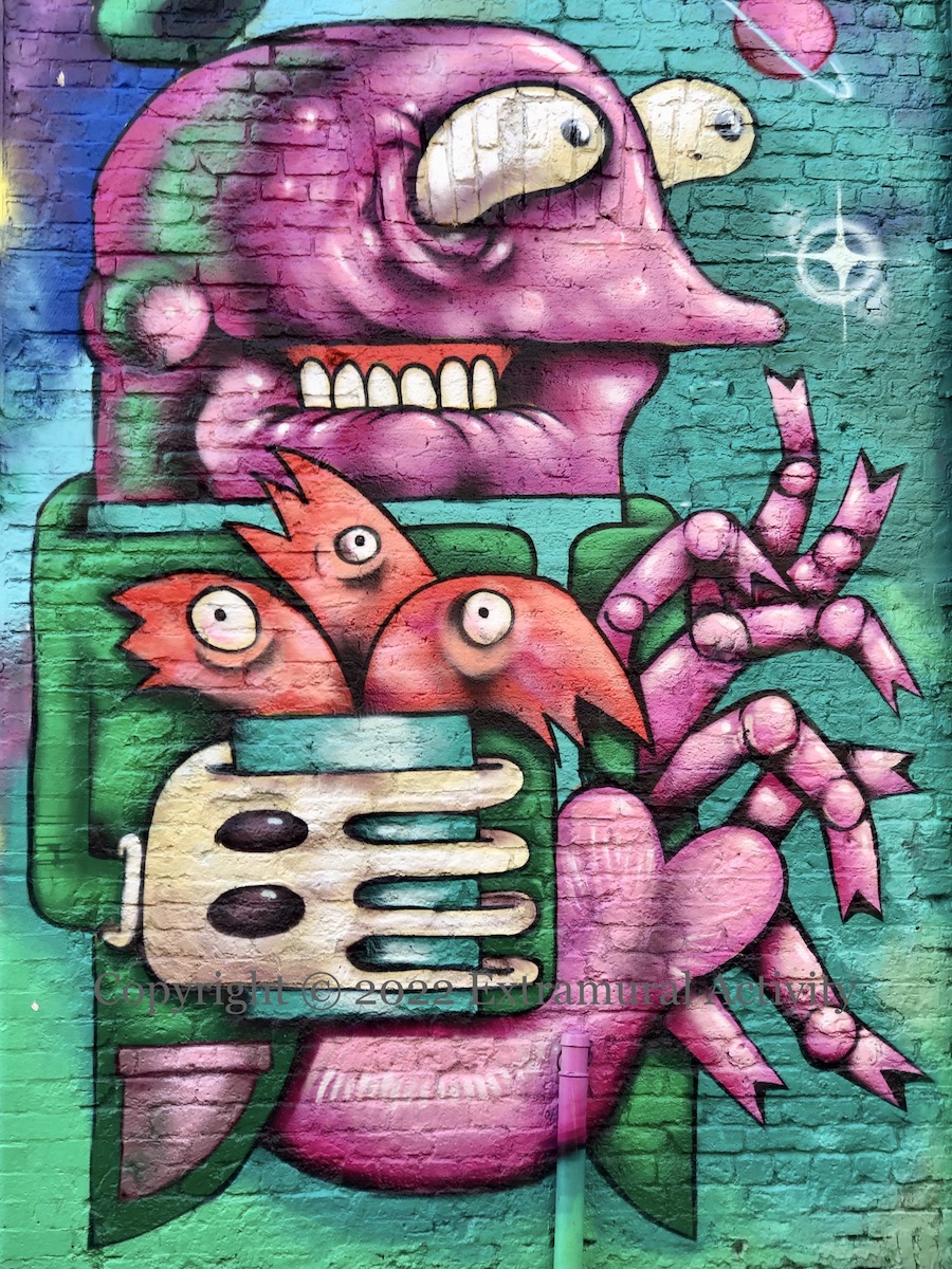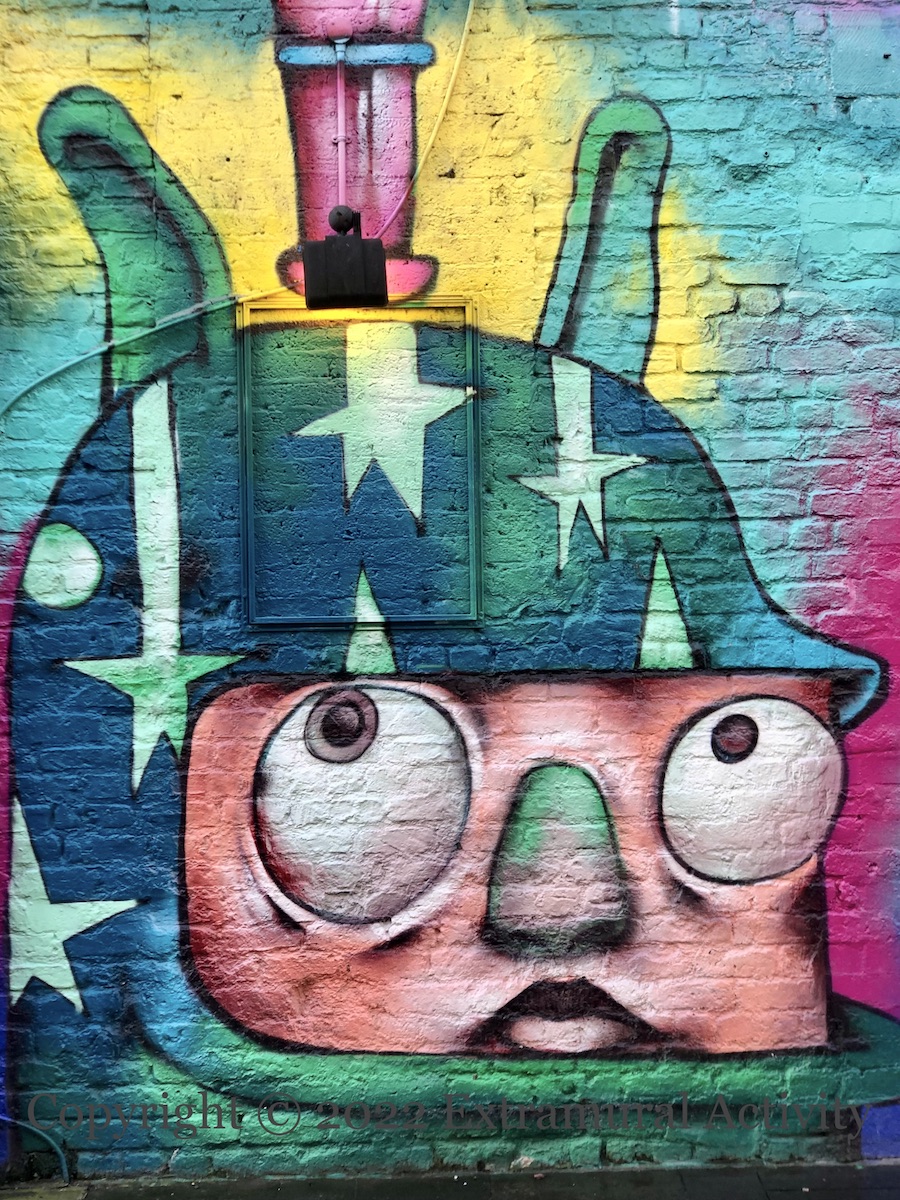 This time last year (2021-04) KVLR (ig | tw | Fb) revamped the mural on the front of the Gordon Street premises with two new characters (above and directly below) and substantial changes to the third (final image). (For the previous version, see Circus Fools.)