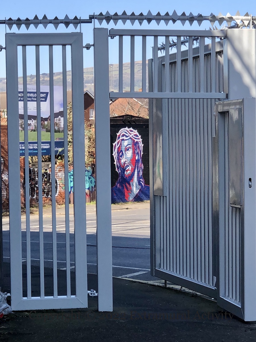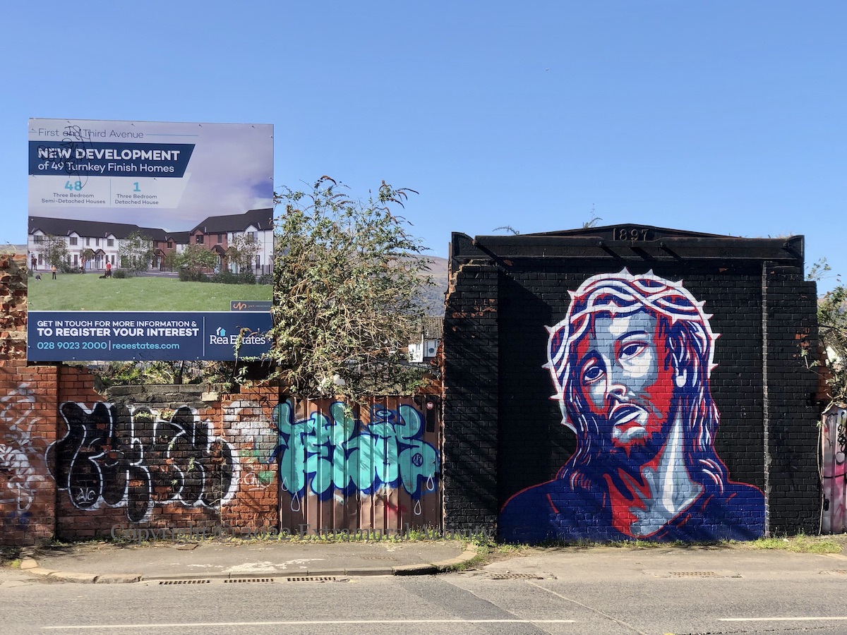 When Cupar Way was constructed (circa 1984) it was a joining stretch of road put in place where the houses along Ashmore Street had been, and joined up (part of) Cupar Street and the old First Street; the new road in toto was called “Cupar Way”. Ashmore had been left undeveloped after the start of the Troubles and despite the presence of the separating barrier from 1969 onward, many of the houses on both sides of the wall were demolished or left vacant for various lengths of time. Carlow Street, for example, was redeveloped in 1981, even before the modern wall was put in place, while Ashmore and the bottom of the old Sugarfield Street was not redeveloped until the mid-1990s. (For more info and maps see the Visual History page of the Cupar Way “peace” line.)