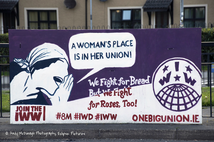 “A woman’s place is in her union! We fight for bread but we fight for roses, too. Join the IWW [Industrial Workers Of The World (web)] OneBigUnion.ie.” The titular phrase comes from a 1910 speech by American suffragist Helen Todd, who later explained that votes for women would mean “helping forward the time when life’s Bread, which is home, shelter and security, and the Roses of life, music, education, nature and books, shall be the heritage of every child that is born in the country” (American Magazine LXXII p. 611)