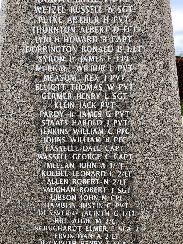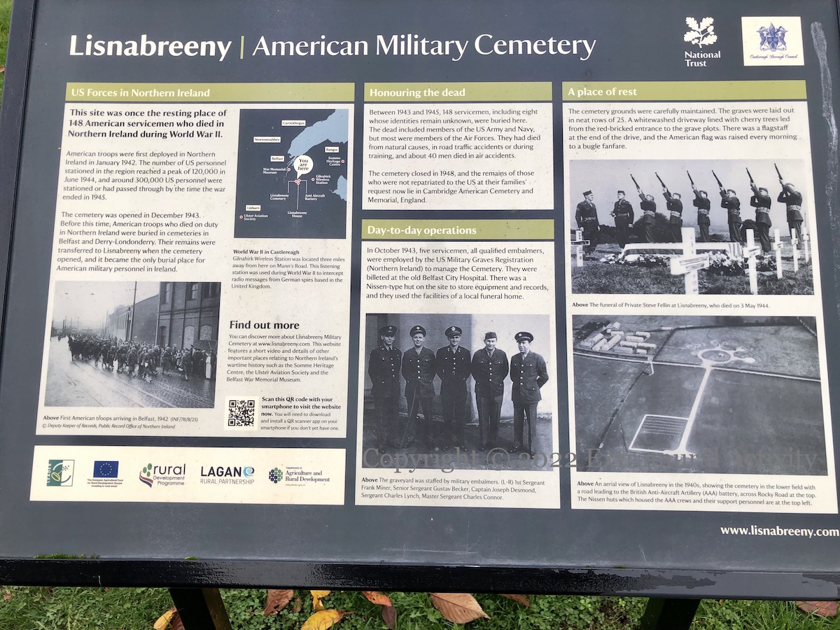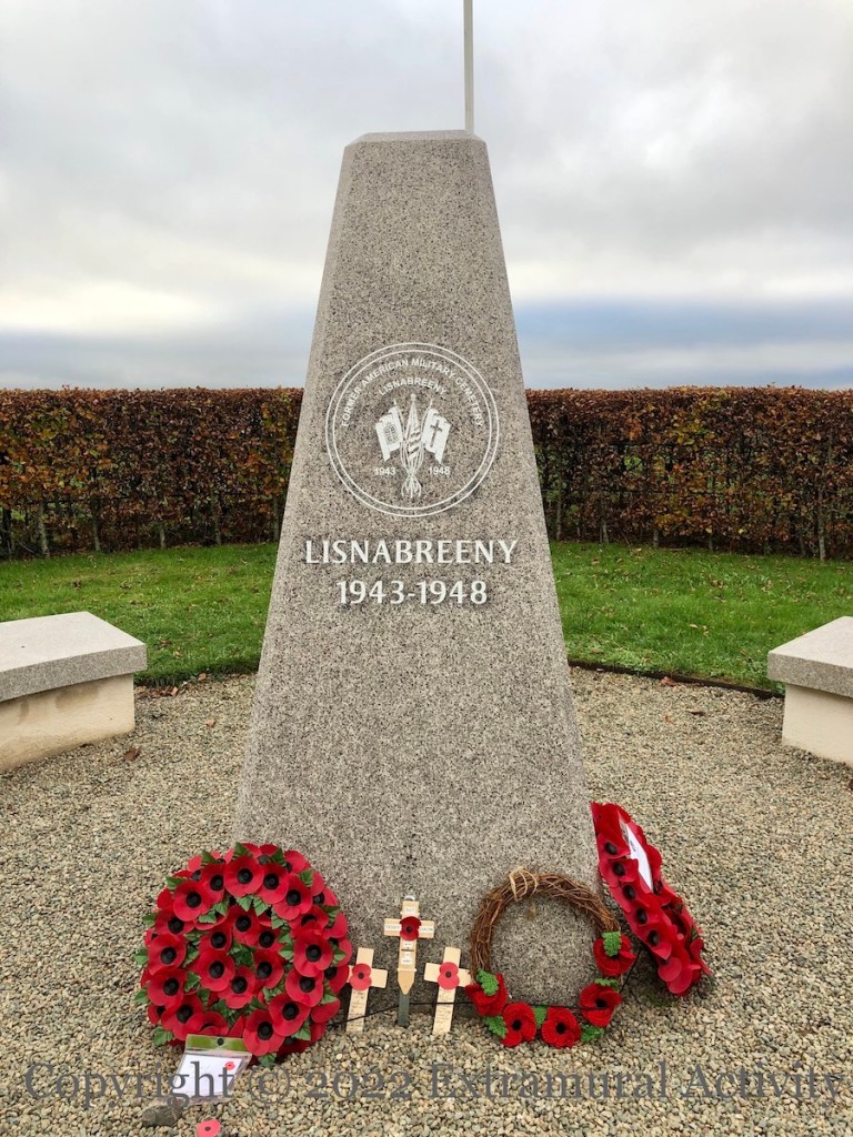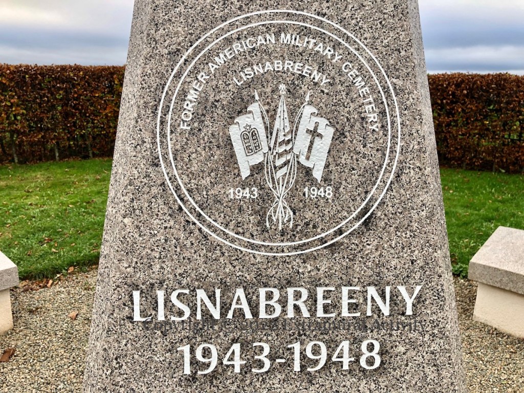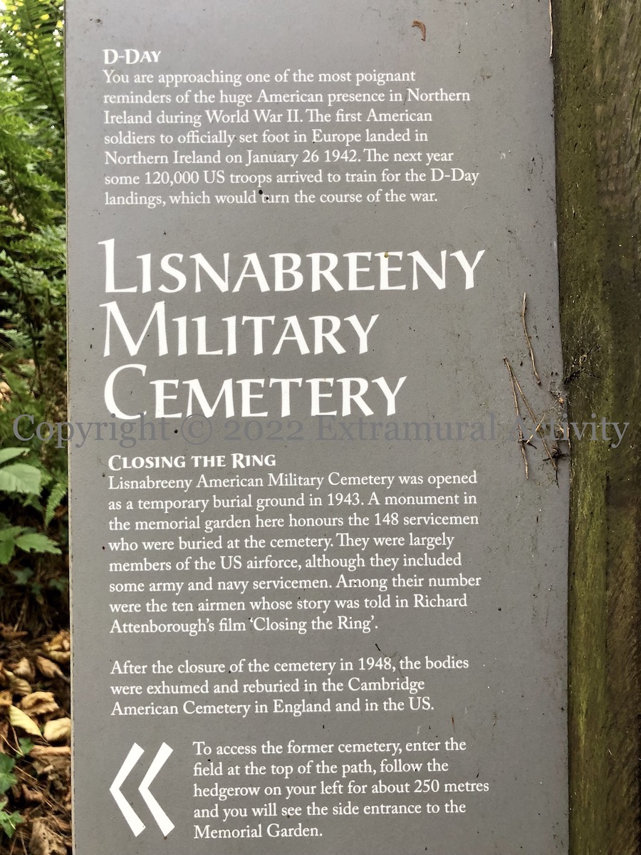 The 148 US servicemen who were buried at Lisnabreeny, in the Castlereagh hills, died in Northern Ireland, and about 40 of them in air accidents, including the ten who died on June 1st, 1944, when a B-17 travelling from Newfoundland crashed into Cave Hill, killing all ten men on board (Wartime NI). The names of all 148 are listed on three sides of the memorial stone; their remains were repatriated or moved to the cemetery in Cambridge, England in 1948.