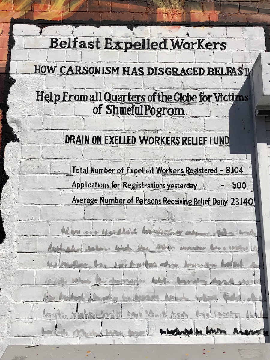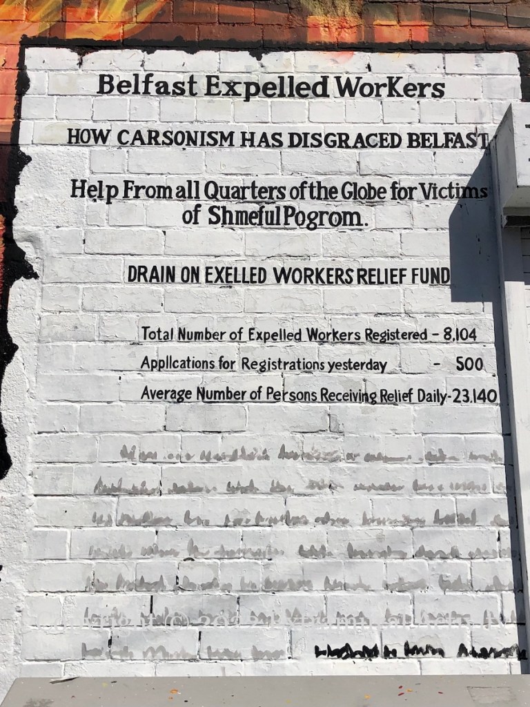 On July 12th, 1920, Edward Carson spoke to a crowd in Derry and, addressing the government in Westminster, said “if you are yourself unable to protect us from the machinations of Sınn Féın, and you won’t take our help; well, then, we tell you we will take the matter into our own hands.” (Treason Felony). Nine days later, the “clearings” of Catholics from Belfast shipyards and mills began, with about 5,700 Catholics and 1,850 socialists (“rotten Prods“) being expelled from Workman Clark and Harland & Wolff yards, and in total 10,000 workers from yards and mills over the next two weeks (History Ireland). In combination with the straitened economic circumstances of the time (post WWI) thousands (23,140 according to this mural, which reproduces a flyer derived from the Irish News of October 6th, 1920 – via The Irish Story’s account of the start of the “Belfast Pogrom”) were on relief.