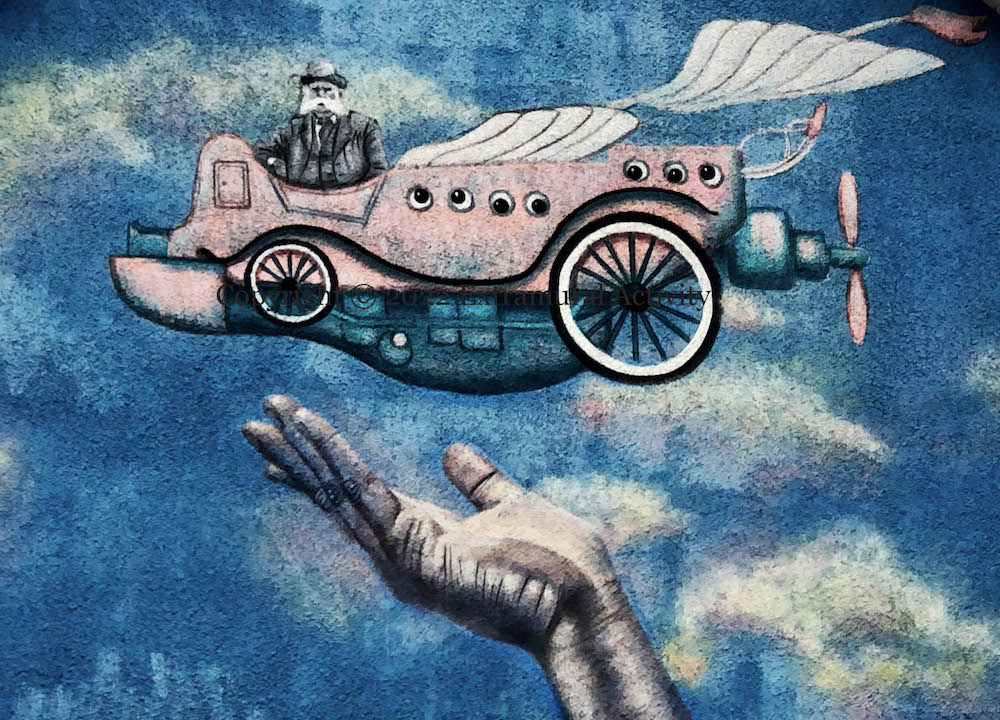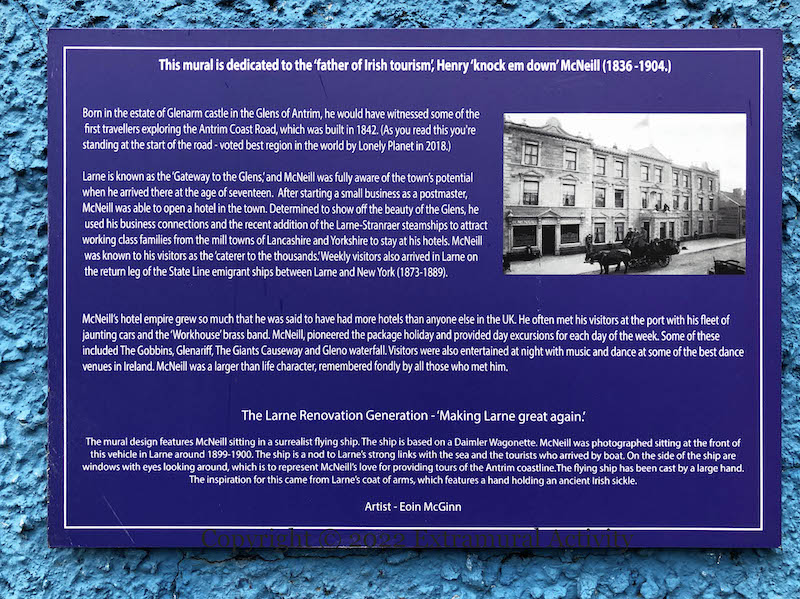 Hotelier Henry McNeill, it is reported, brought the horseless carriage to Larne in 1899, in the form of a Daimler Wagonette that he used to ferry guests up and down the coast and in to scenic spots in the Glens Of Antrim – the mechanical future combined with of the timeless beauty of the natural world. Here is a photo of McNeill aloft in 1899; emic (ig) recasts the image as though he were at the helm of a flying machine.