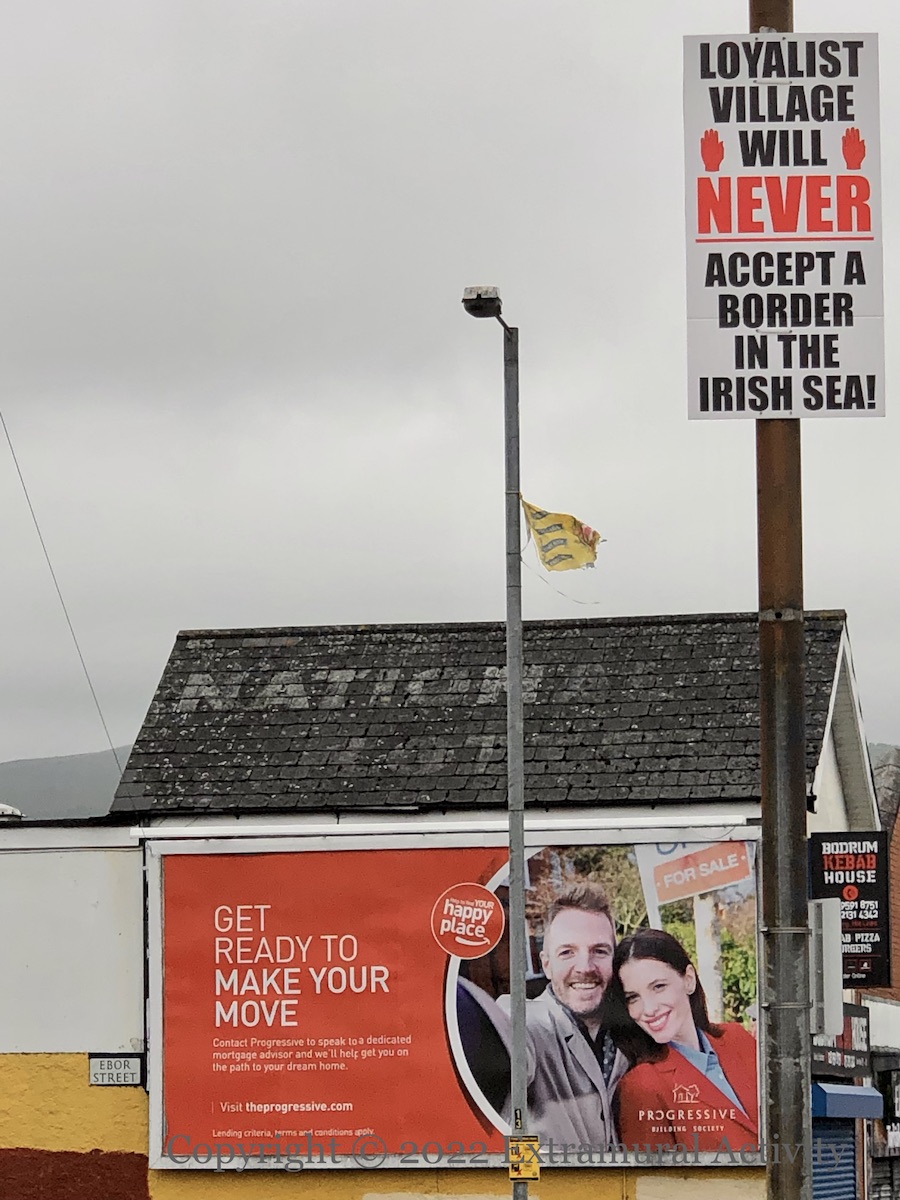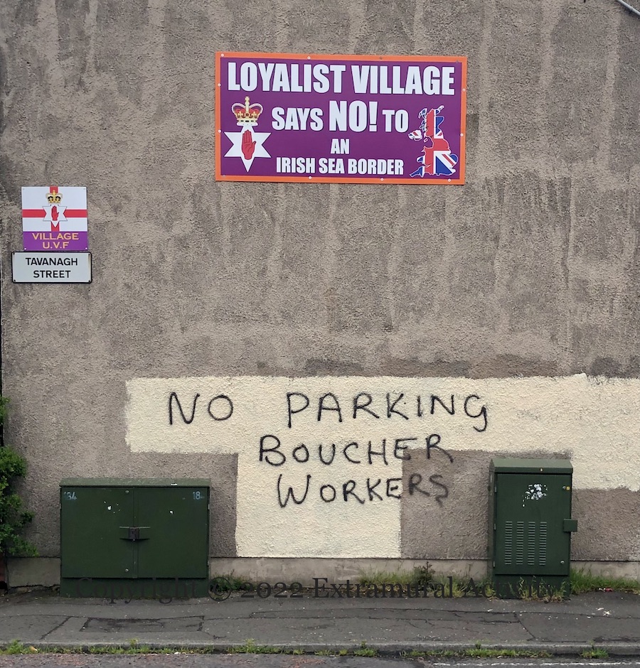 Here are two signs of protests at the NI Protocol along with the third version of graffiti complaining about parking spaces being taken by people working at the Boucher Road complexes. The original version (in 2020) threatened that “your car will be burnt” (Street View). It’s not clear whether it’s new construction or existing businesses that are the target, though the Boucher Road area has been busy, with a refit of B&Q (BelTel) and new Lidl being built next to the Olympia (BelTel) (not to mention the stage for the Ed Sheeran concerts (Newsletter)).