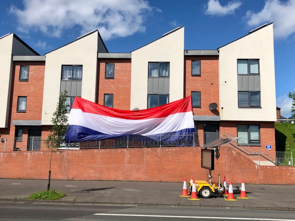 There was plenty of support in Belfast for Scottish club Glasgow Rangers as they travelled to Seville last week to compete in the Europa League (previously the “UEFA Cup”) final – the initial images in today’s post show a huge number of banners outside the Berlin Bar on the Shankill (see previously Inter City Regiment), a scarf in the West Kirk Presbyterian (Fb) graveyard (see Who Went To War And Never Returned), and – on the Shore Road in north Belfast – the flag of the Netherlands pressed into service for its red, white, and blue.