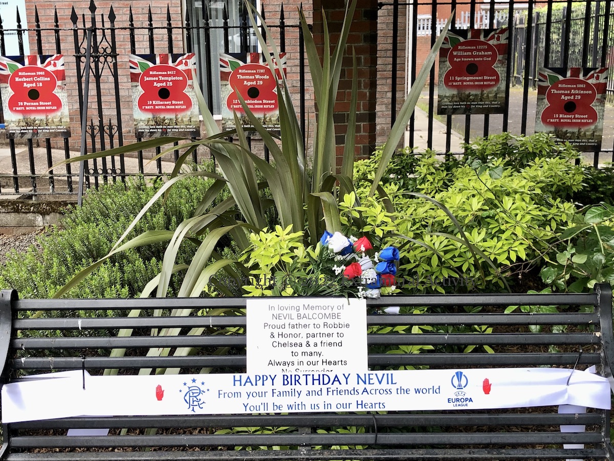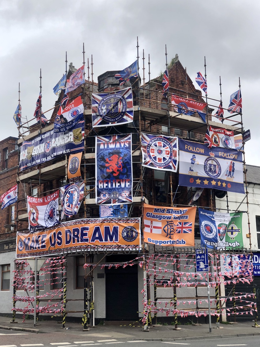 There was plenty of support in Belfast for Scottish club Glasgow Rangers as they travelled to Seville last week to compete in the Europa League (previously the “UEFA Cup”) final – the initial images in today’s post show a huge number of banners outside the Berlin Bar on the Shankill (see previously Inter City Regiment), a scarf in the West Kirk Presbyterian (Fb) graveyard (see Who Went To War And Never Returned), and – on the Shore Road in north Belfast – the flag of the Netherlands pressed into service for its red, white, and blue.
