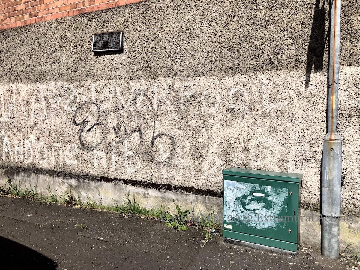 “IRA 2, Liverpool 0, and one hit the bar.” This is 35-year-old graffiti that seems to be more durable than the paint that was used to white it out.