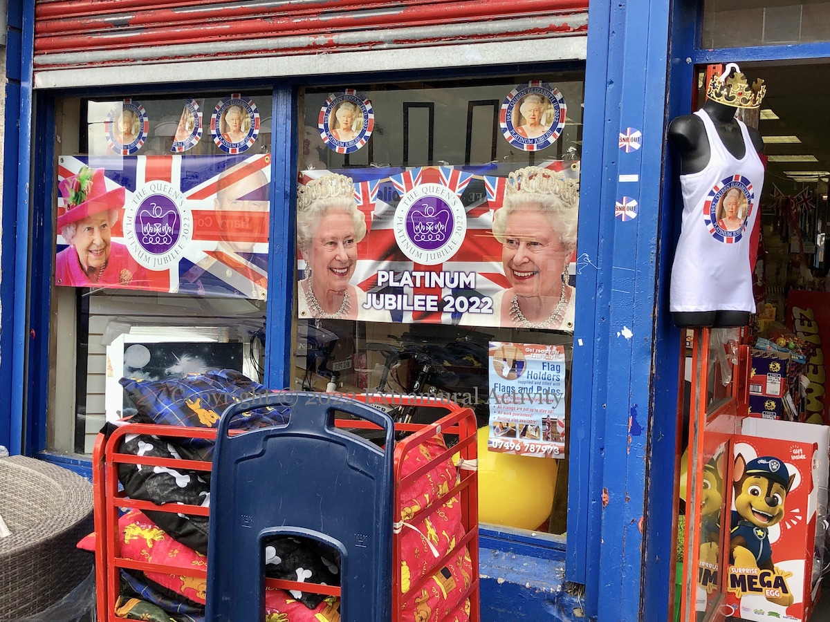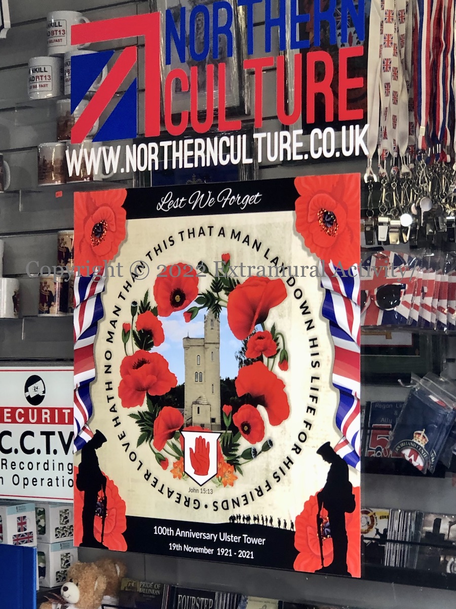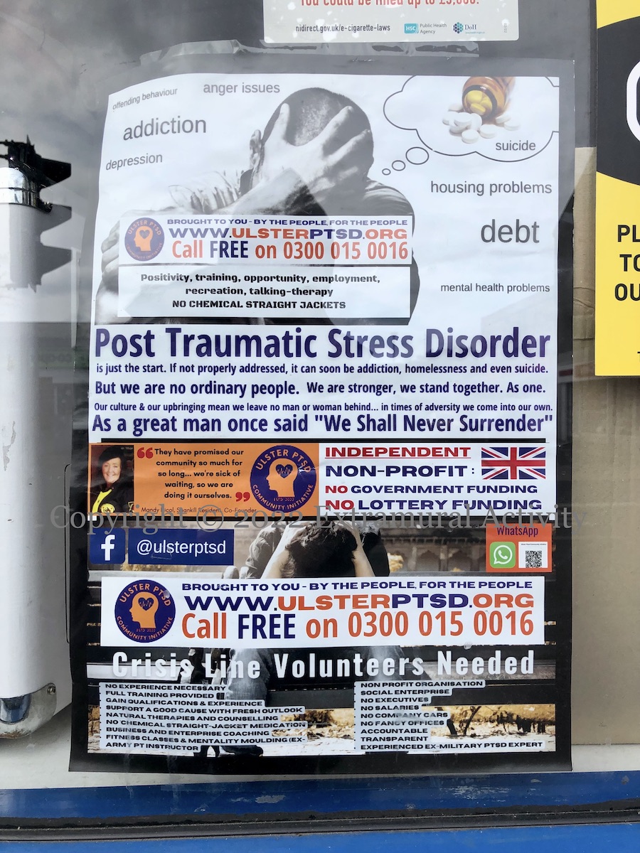 An Orange parade to celebrate the centennial of Northern Ireland – postponed last year on account of the pandemic – will take place today, with roughly 130 bands marching from Stormont to Belfast city centre (Belfast Live). There is not much indication of the parade in posters or murals, perhaps because the anniversary itself has passed. If we read the community’s concerns from the displays in the window of this Shankill Road shop (just above the old Beresford St and the Mussen Cortège mural), they include the NI centenary and the murder of Lee Rigby (WP) (image above), PTSD (second image), the upcoming platinum jubilee of Queen Elizabeth (third) – we will have more jubilee photos over the coming week, and the centenary of the Ulster Tower WWI memorial (see e.g. Our Heritage In Your Hands).