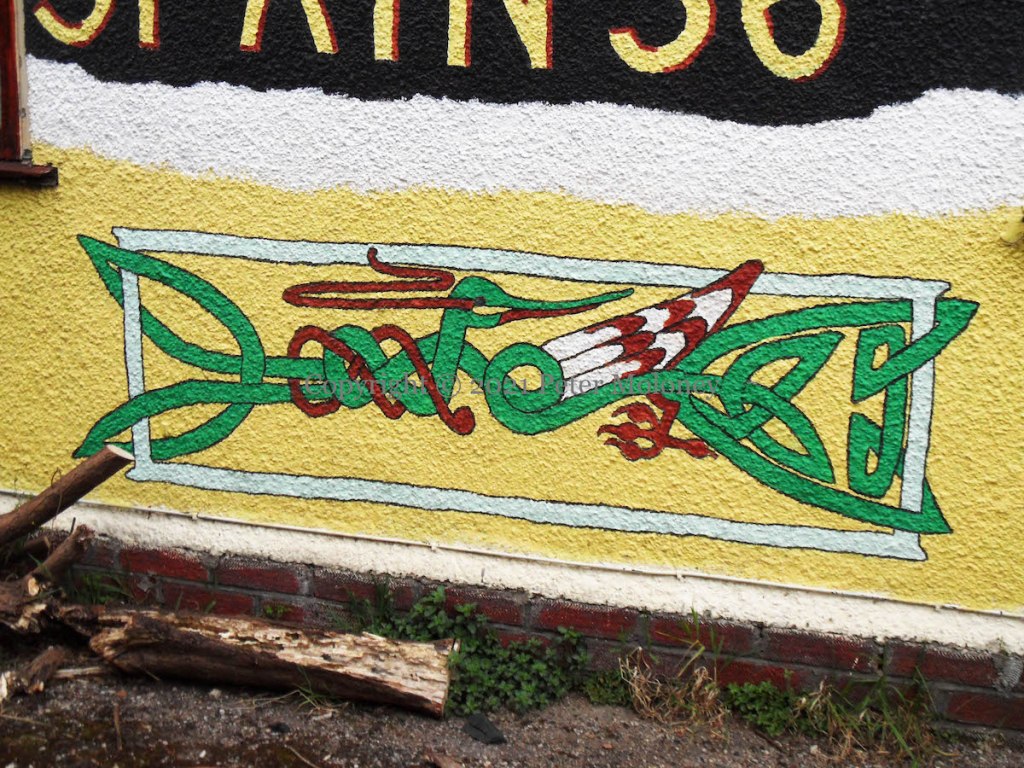 The artist is unknown; the knotwork at the bottom of the mural resembles some from St James’s, Belfast.