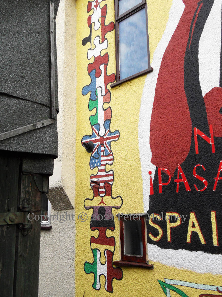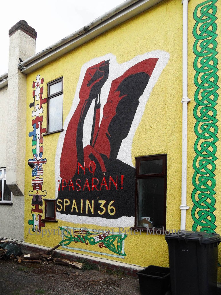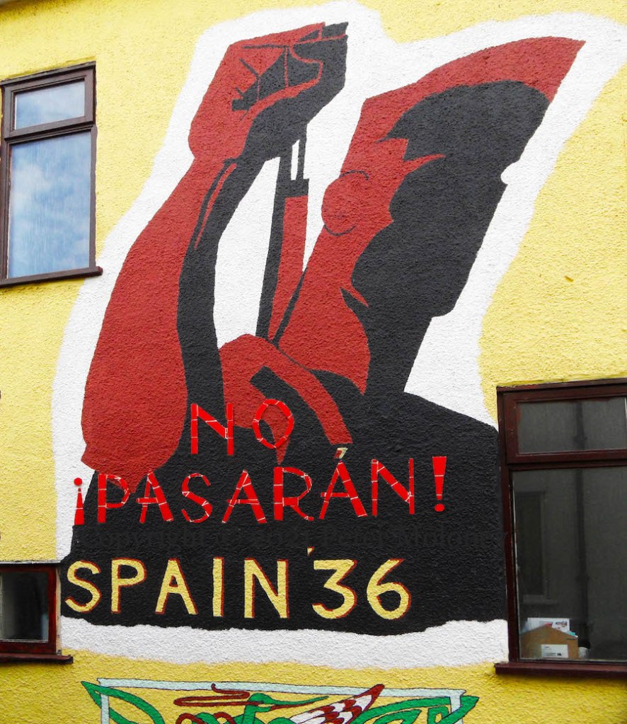 More than 35,000 from more than 80 countries people – see the jigsaw pieces on the left of this mural – joined the International Brigades in the Spanish Civil War, including 2,300 from Britain and Ireland (Guardian). The slogan “¡No pasarán!” [They shall not pass] comes from a speech by Dolores Ibárruri (“La Pasionaria”) in July 1936: “The Communist Party calls you to arms. We especially call upon you, workers, farmers, intellectuals to assume your positions in the fight to finally smash the enemies of the Republic and of the popular liberties. Long live the Popular Front! Long live the union of all anti-fascists! Long live the Republic of the people! The Fascists shall not pass! They shall not pass!” (WP)