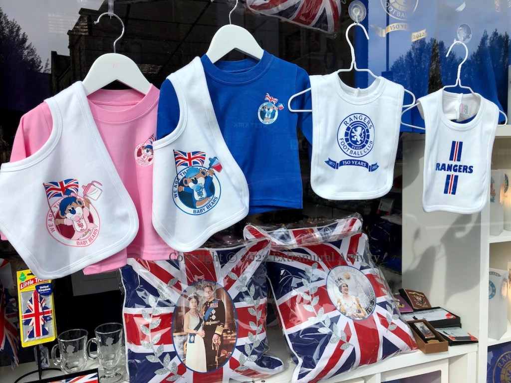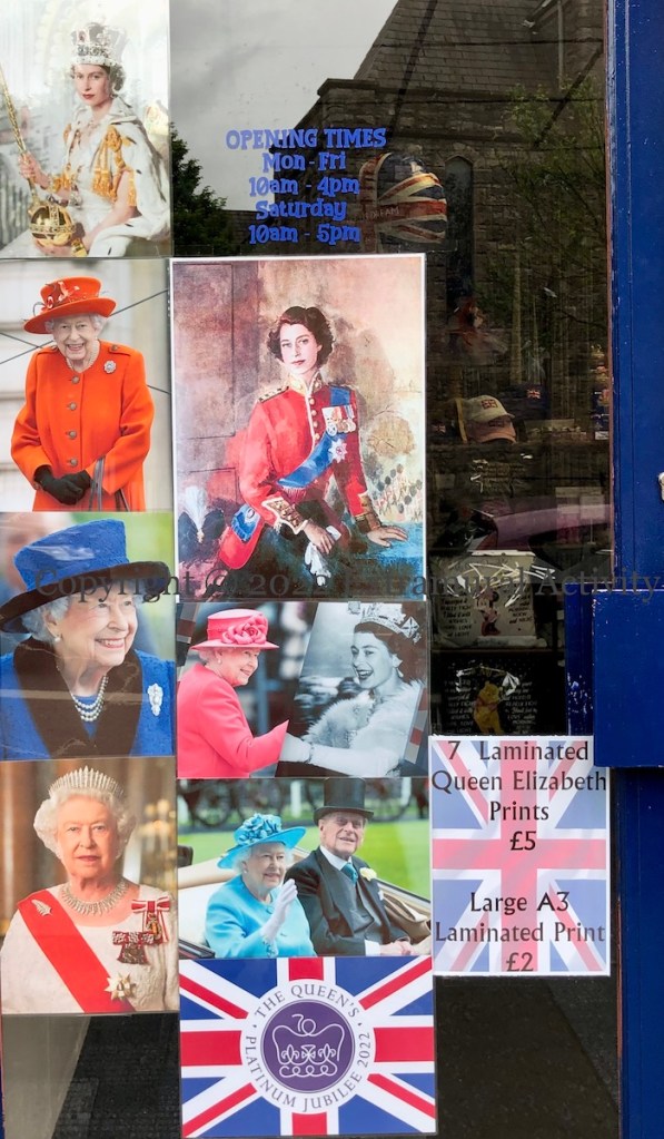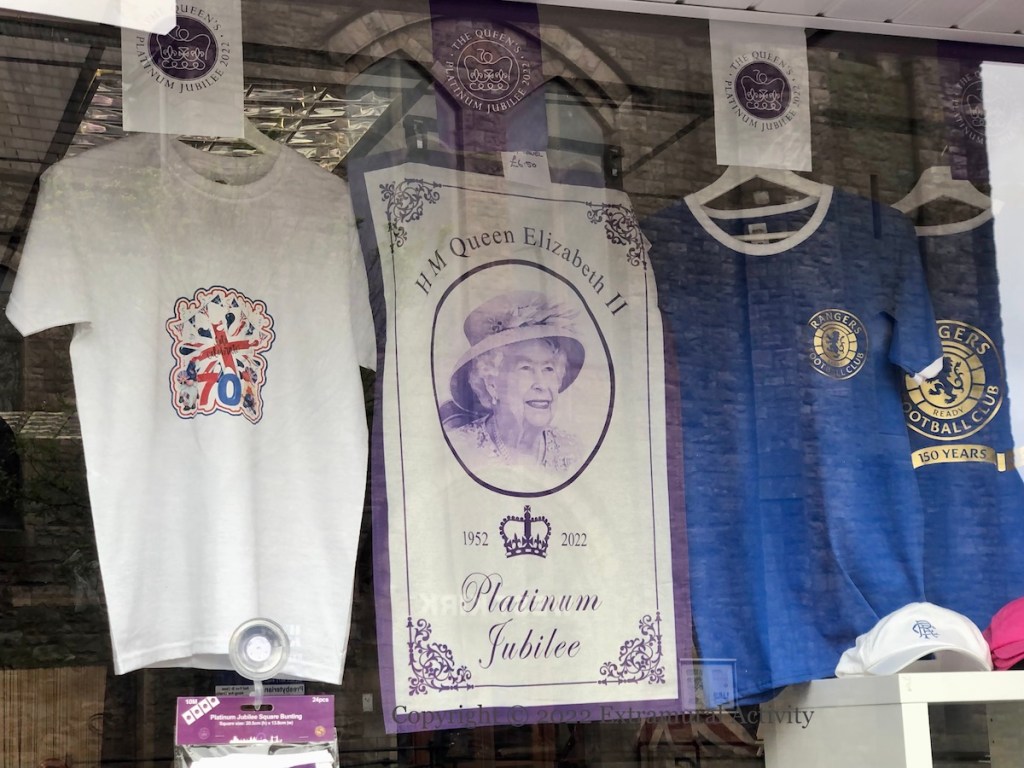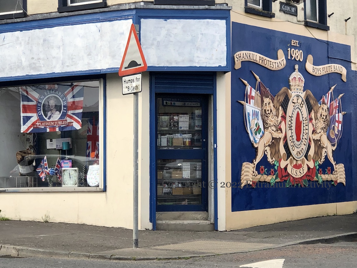 The celebrations for Queen Elizabeth’s platinum (70th) jubilee officially began yesterday with the “trooping of the colour” (Guardian) (a birthday parade – which has been notable here for a BBC commentator’s description of the Irish Guards as “micks” (BelTel)) and the lighting of 1,500 beacons (Sky). Today’s church service at St. Paul’s Cathedral in the Queen’s honor will take place without her after she (again) experienced “mobility issues” on Thursday (Guardian). Today’s images are of jubilee merchandise for sale in Shankill shops.