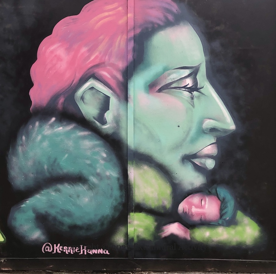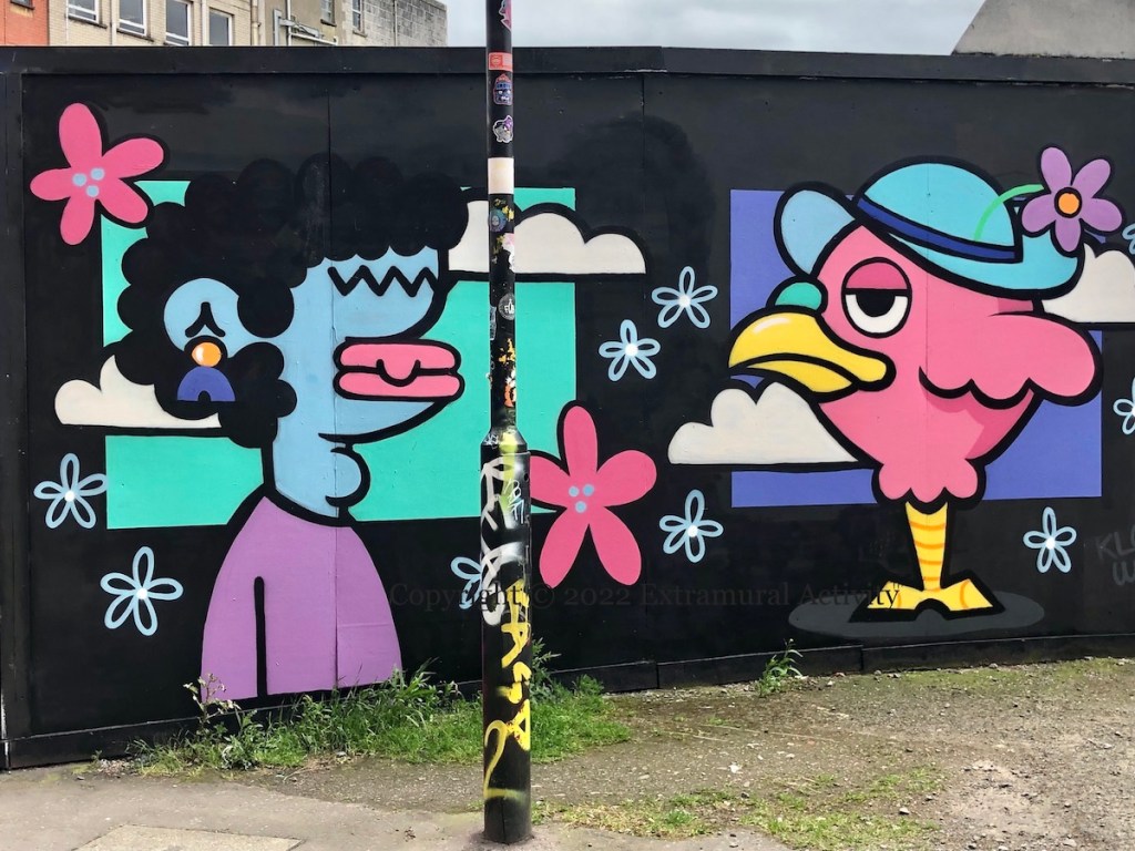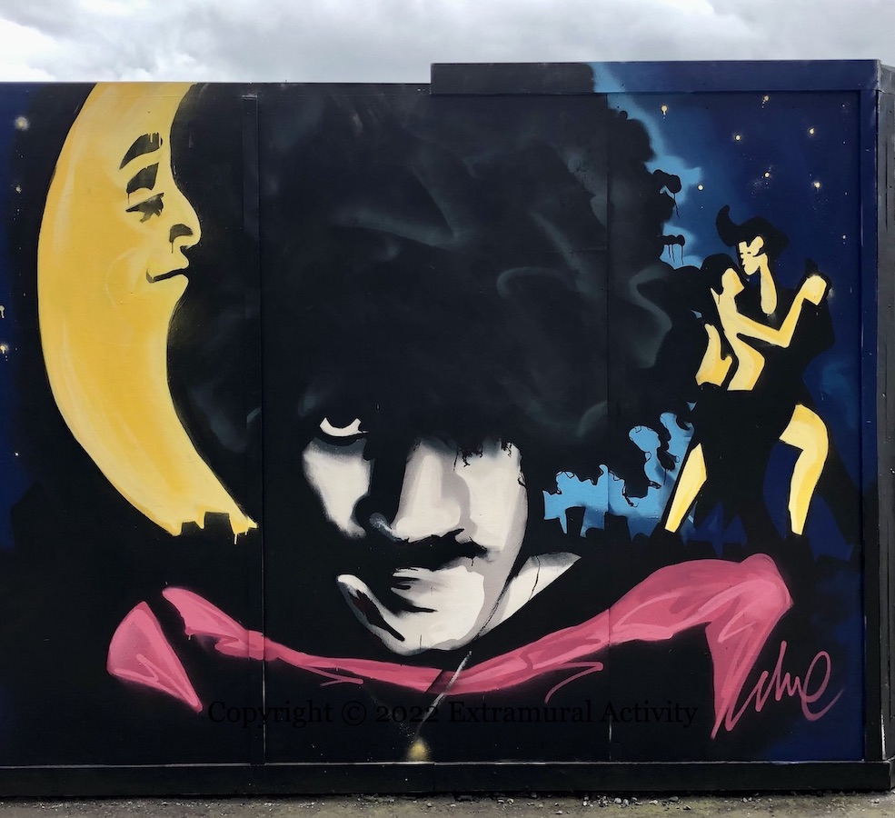 Hit The North (organised by Seedhead Arts and sponsored by Hennessy) brings street artists from around the world to Belfast. All of today’s images – which show the lower west side of Kent Street – are by artists from Ireland, north and south – with work by KloWi (ig), Conor McClure (ig) who has painted Phil Lynott, NRMN (Gerry Norman ig), HM Constance (ig), Kilian (ig) who has painted UK chancellor Rishi Sunak saying “Give me all your money, punk”, Liam Gillick‘s quote “How can quantum gravity explain the origin of the universe?” (previously in lower Ormeau) by Laura Nelson (ig), Kerrie Hanna (ig), and All The Doodz (ig).