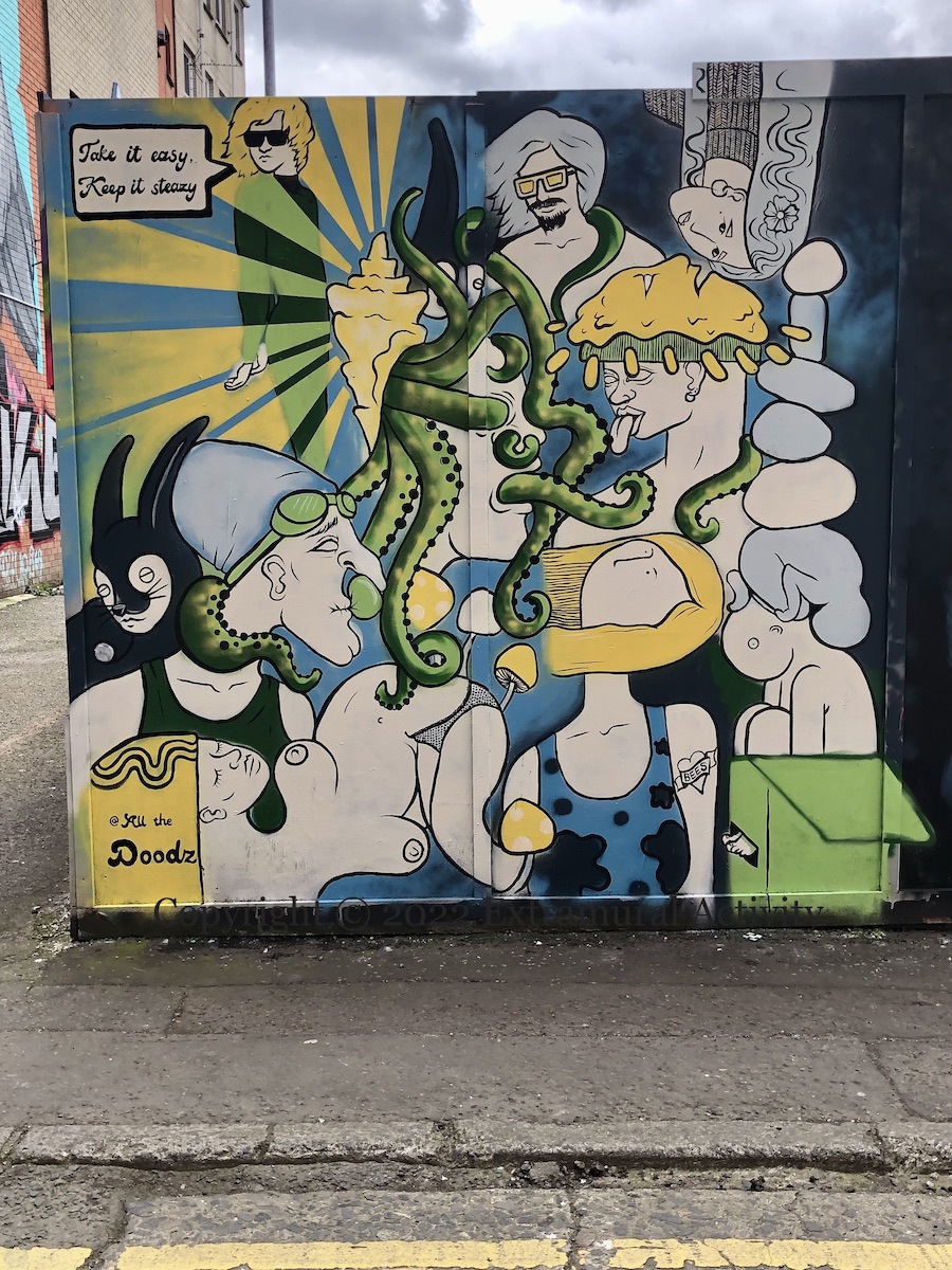 Hit The North (organised by Seedhead Arts and sponsored by Hennessy) brings street artists from around the world to Belfast. All of today’s images – which show the lower west side of Kent Street – are by artists from Ireland, north and south – with work by KloWi (ig), Conor McClure (ig) who has painted Phil Lynott, NRMN (Gerry Norman ig), HM Constance (ig), Kilian (ig) who has painted UK chancellor Rishi Sunak saying “Give me all your money, punk”, Liam Gillick‘s quote “How can quantum gravity explain the origin of the universe?” (previously in lower Ormeau) by Laura Nelson (ig), Kerrie Hanna (ig), and All The Doodz (ig).