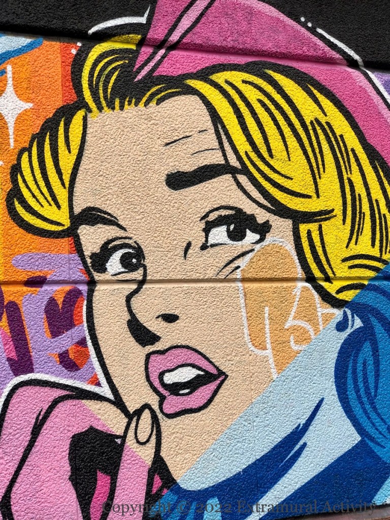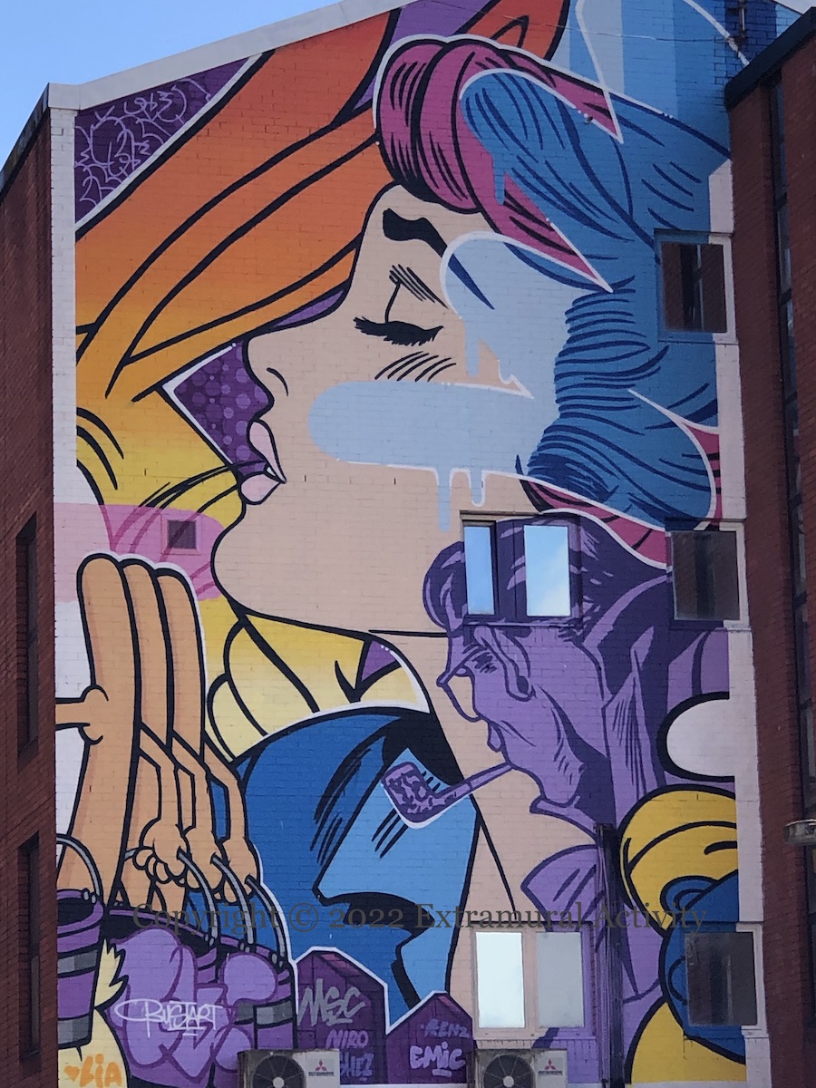 Two from Swiss artist Bust (ig | web) for HTN22, who describes his current work as “neo-pop”, combining pop art, cartoon characters, and traditional graffiti writing. The smaller piece is in Donegall Street, the multi-storey one can be seen from Kent St. A third, more casual, piece can be seen in Love, Loss, And Beyond .