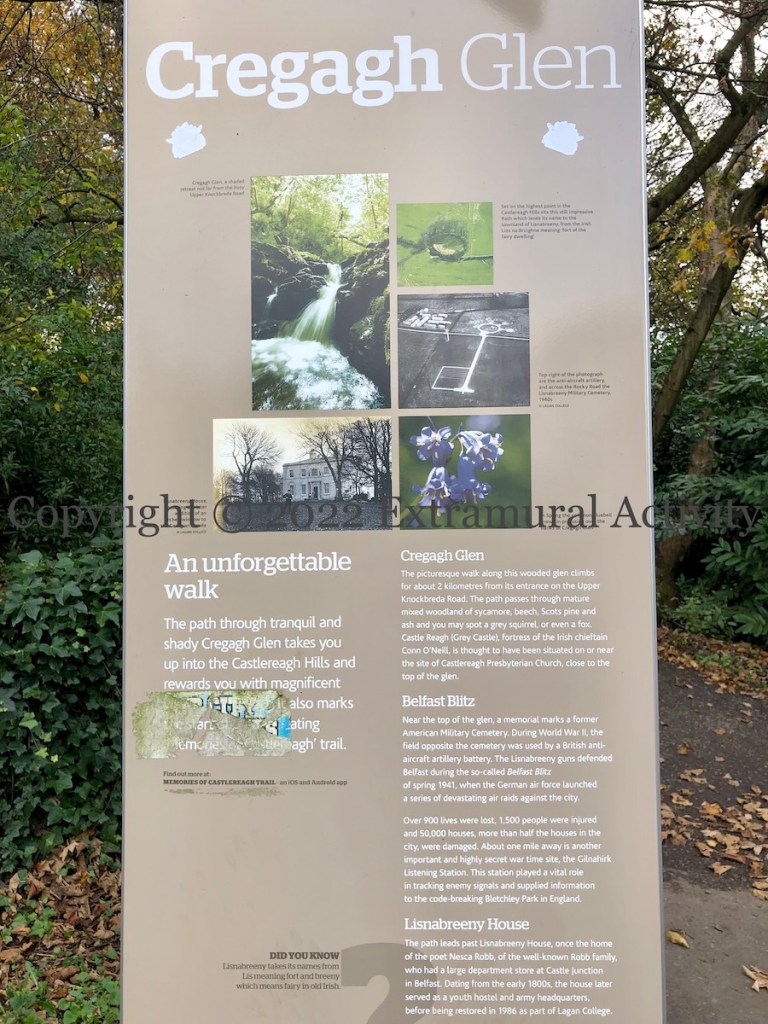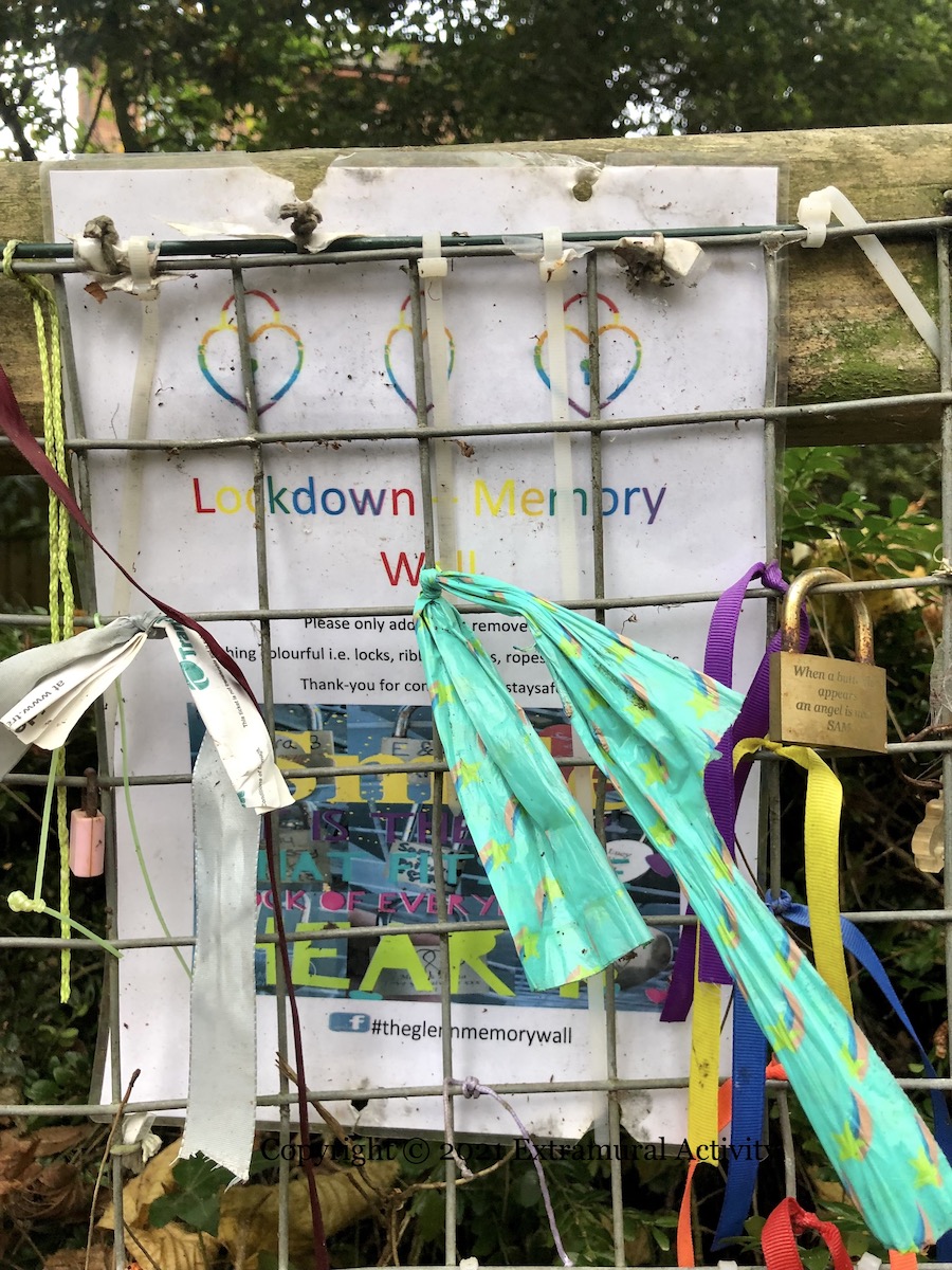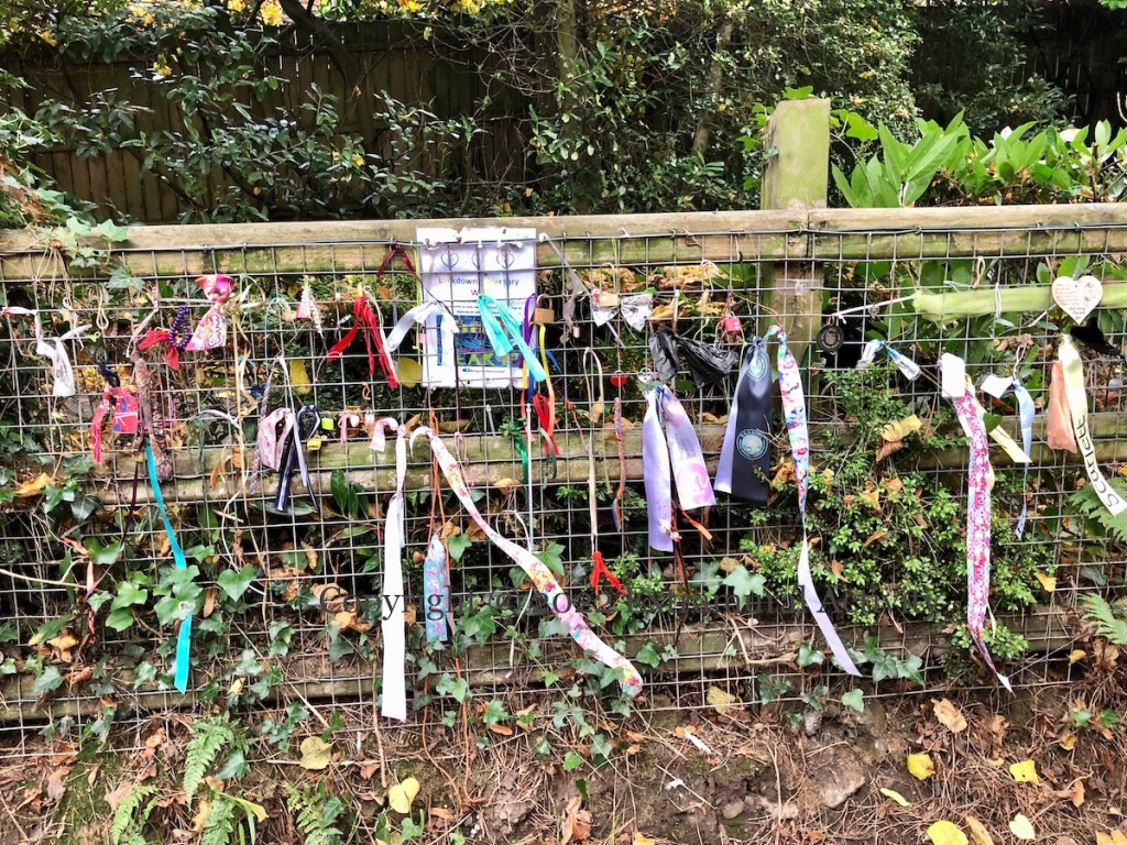 The Cregagh Glen – Lisnabreeny walk (National Trust) is home to a memorial marking the site of the (former) Lisnabreeny American Military Cemetery (featured previously). Today’s images feature a smaller and more recent memorial site, to the coronavirus lockdown. The sign asks for colourful items such as locks and ribbons but the picture above also shows a Translink ticket and a doggie poop bag.