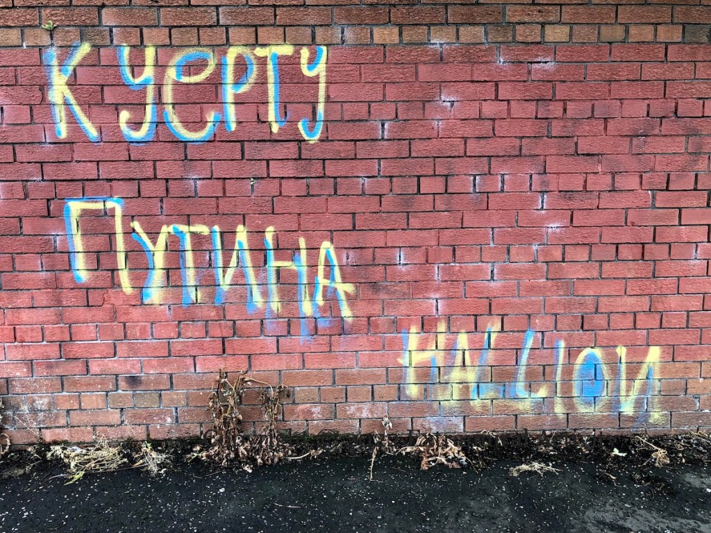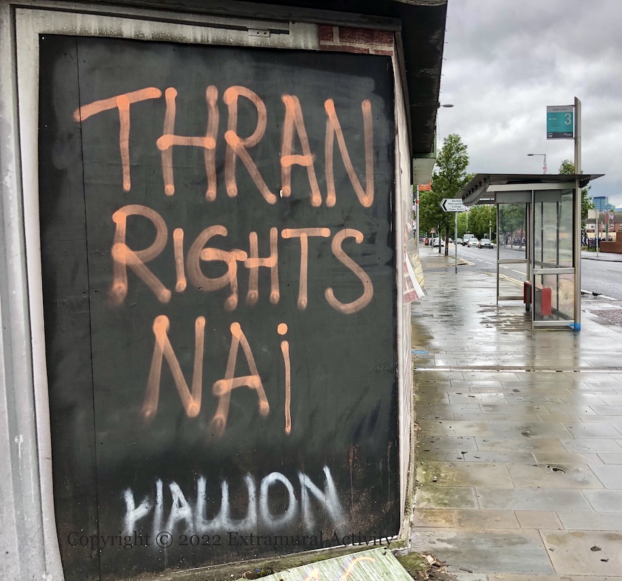 Topical commentary from East Belfast graffitist Hallion: Above, “к черту Путина”, in the blue-and-yellow of Ukraine, is Russian for “To hell with Putin” (or something a bit stronger); below, “Thran rights nai” – “thran” is an Ulster-Scots word meaning “stubborn” or “contrary” (entry for thra – the related verb – at Hamely Tongue) but perhaps here standing for Ulster-Scots in general and commenting on the tortured history of what is now (as of May 2022) the ‘Identity & Language’ bill (BBC) covering Irish/Gaeilge and Ulster-Scots/Ulstèr-Scotch in Northern Ireland. “Hallion” is itself is a Scots/north England word, meaning a scoundrel or rapscallion (MW | etymonline).
