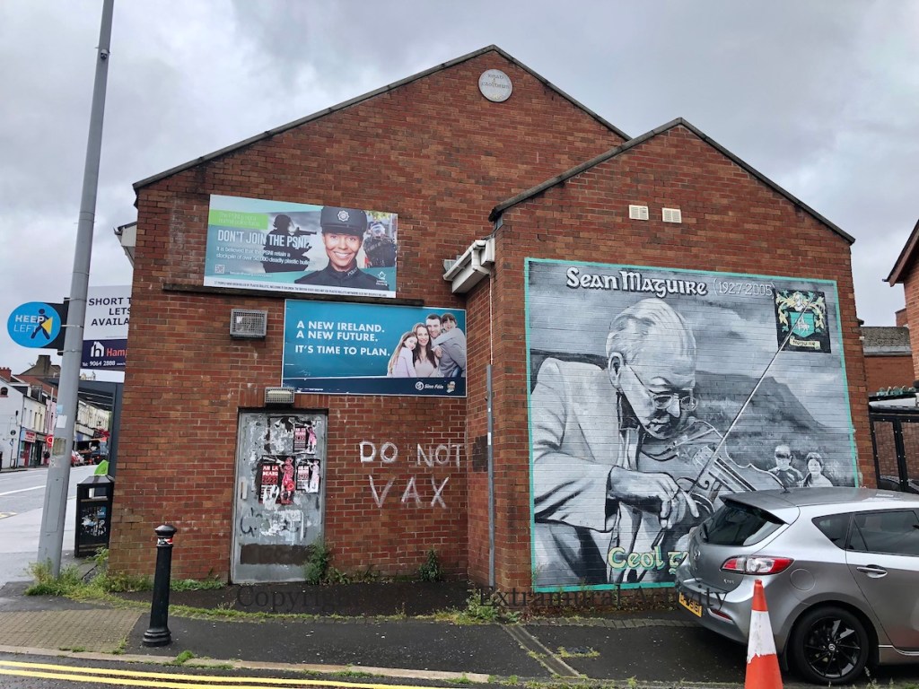 “Do not vax” and “Don’t join the PSNI”. “Do not vax” is a coronavirus conspiracy theory, related to What We Want You To Think, We Want A Free Future and also 5G Kills You and A Tale Of Two Protests.