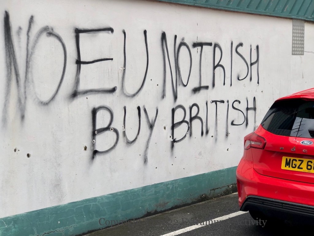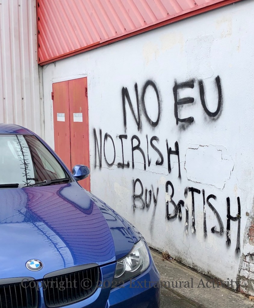 The graffiti reads “No EU, No Irish, Buy British” but the cars parked in front of these graffiti are a BMW – a German company with factories also in China, Mexico, the Netherlands, South Africa and the US (WP) – and a Ford – a US company with factories all over the world, but since 2002 Ford cars have not been made in Britain (WP). The graffiti is a protest at the NI Protocol (as seen in roughly 22 previous posts).