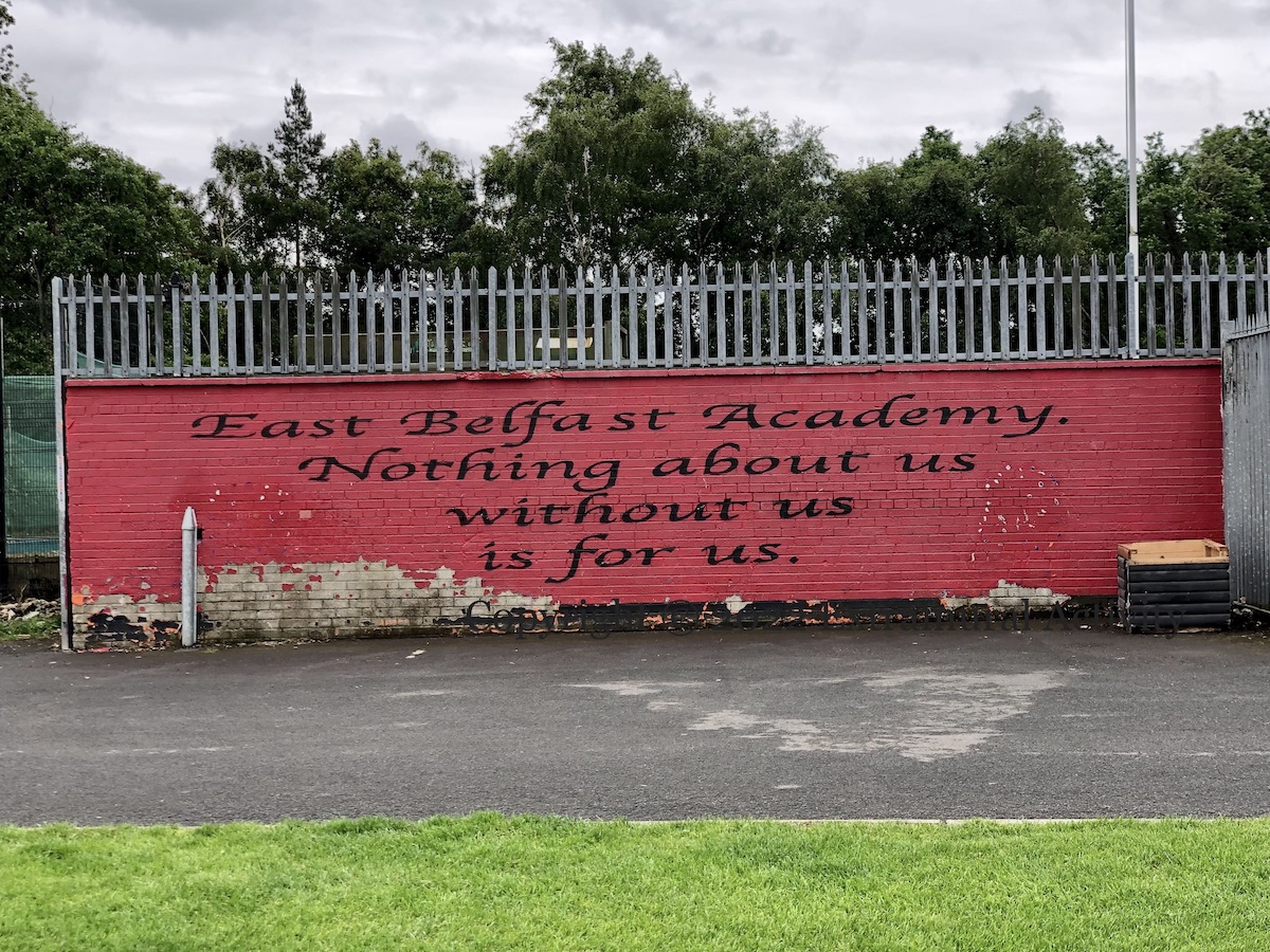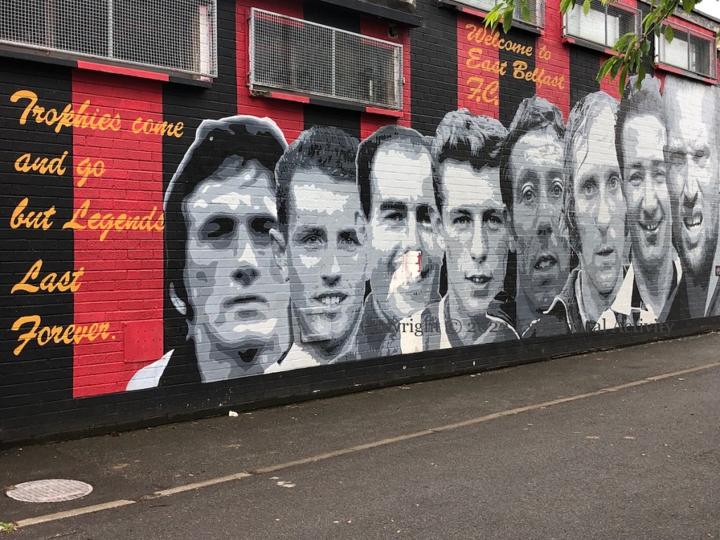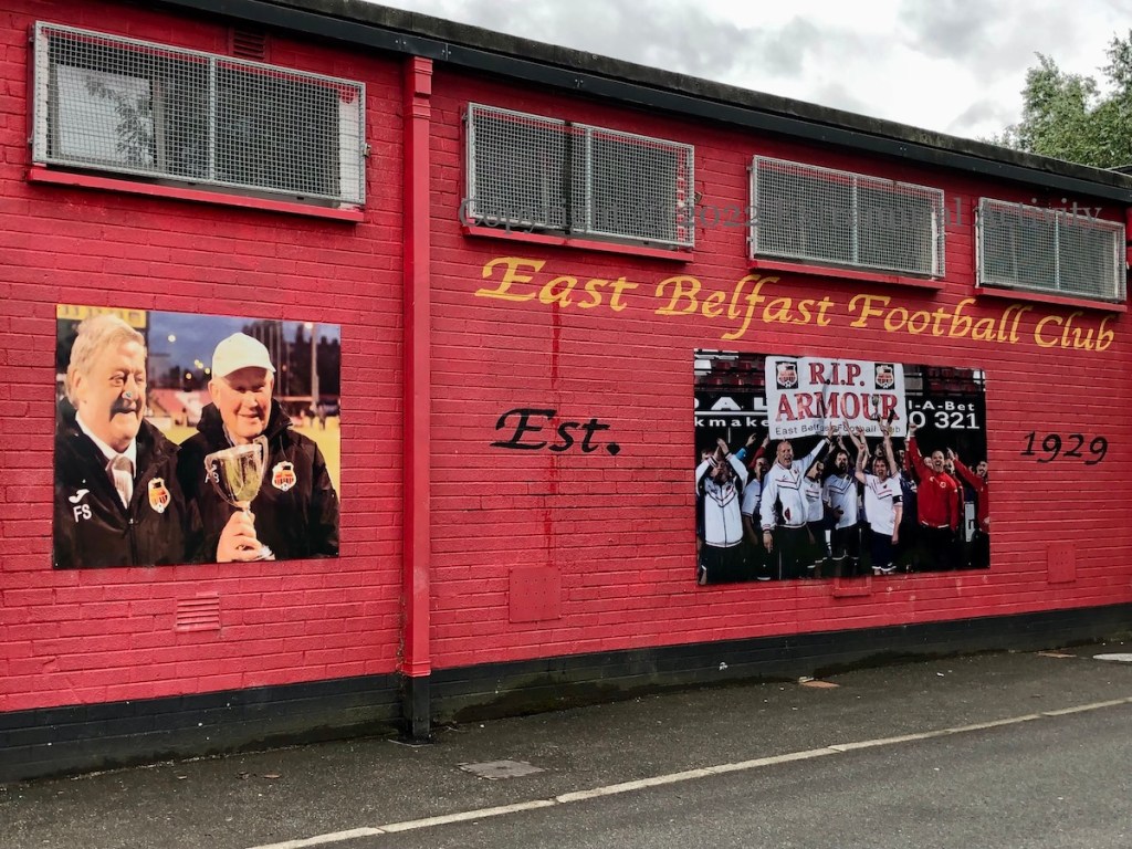 “Trophies come and go but legends last forever.” Scott Harvey and Lee Findlay have taken over as the management team of Northern Amateur Football League premier division team East Belfast FC (Fb) (Belfast Live) due to sequestration in connection with the UVF show of strength in Pitt Park in February, 2021 (Belfast Live). The club’s home field is East Park where the mural above stands to former greats (from left to right) Billy Caskey, Billy Humphries, Sammy McCrory, Ian Lawther, Walter Bruce, Roy Coyle, Tom Casey, and Warren Feeney.