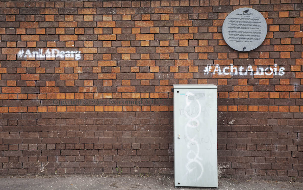 The Identity And Language bill is making its way through the House Of Lords. Here is the web page for the stages of the processes. The “report” stage – when it is open to the whole body for amendment – begins on July 6th; the bill drew criticism from DUP peers during the second reading (BelTel). The graffiti and stencil shown above in support of an Act is on the Falls Road.
