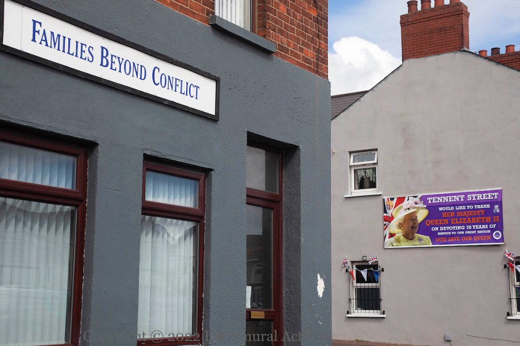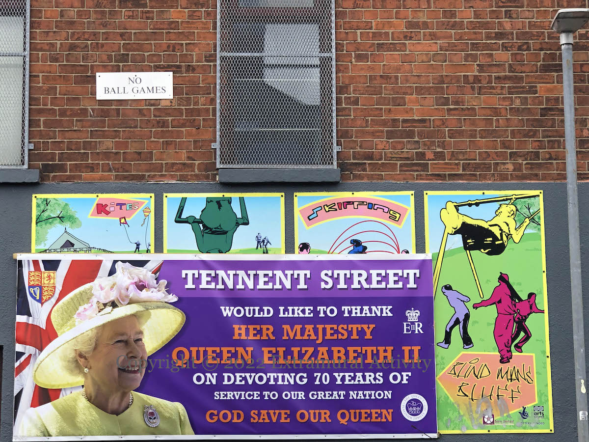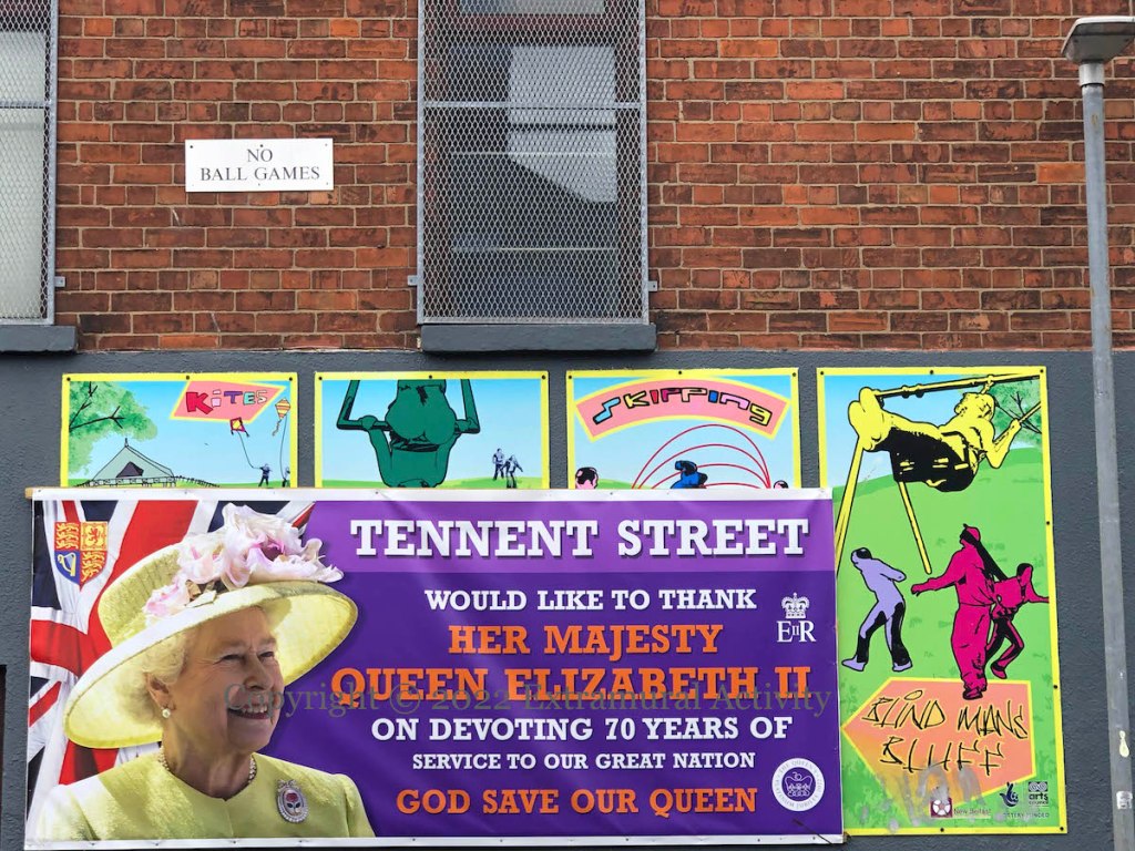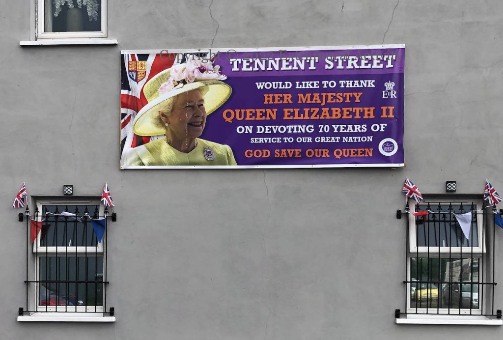 PUL areas all over Belfast have their own version of this tarp celebrating Queen Elizabeth’s platinum jubilee; the one shown today is in the upper Shankill: “Tennent Street would like to thank her majesty Queen Elizabeth II on devoting 70 years of service to our great nation. God save the Queen.”