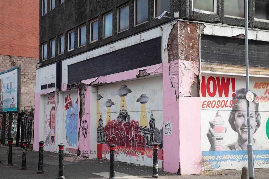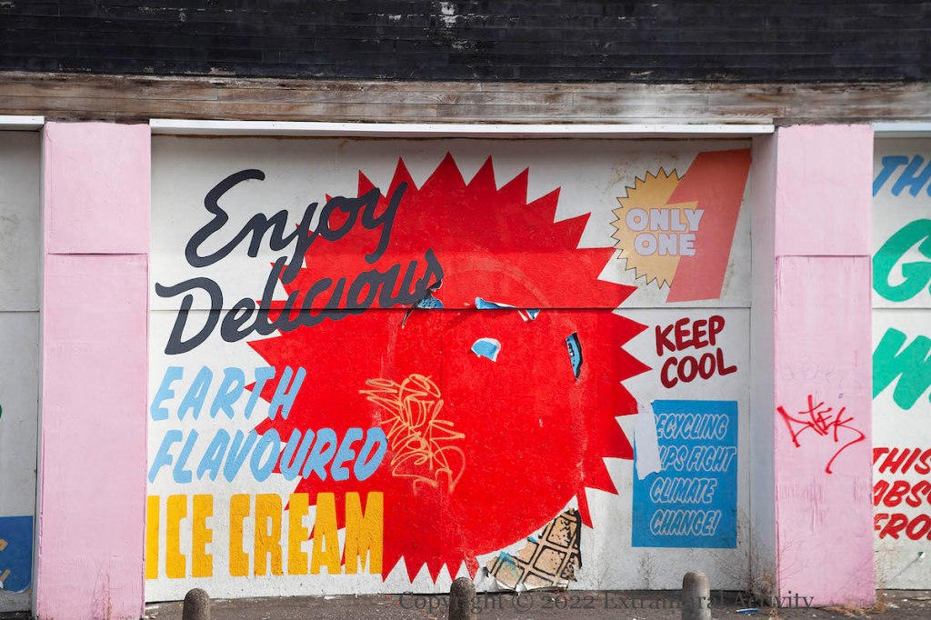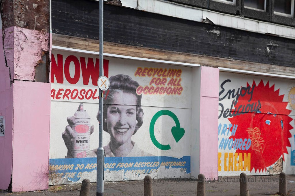 For Recycle Week 2021 (WRAP), Laura Nelson (ig) and Leo Boyd (web) installed a series of seven pieces (each a combination of sign-writing and paste-up) on Fanum House, using CO2-absorbing paint (from Graphenstone) and a potato-based glue for the paste-ups. “A revolution in recycling!”
