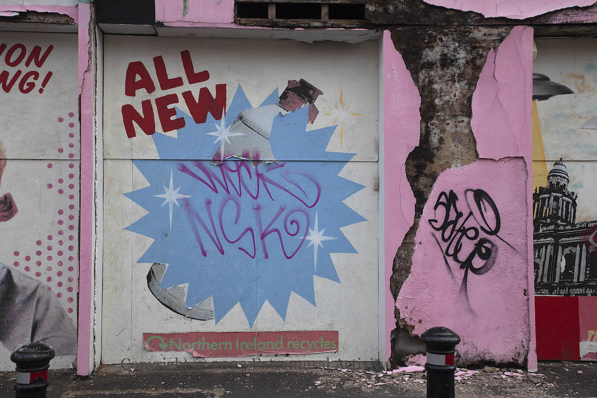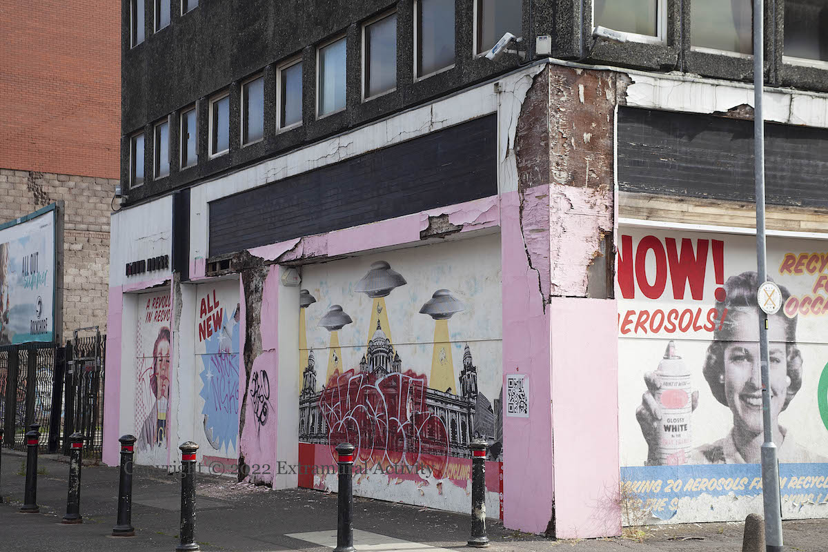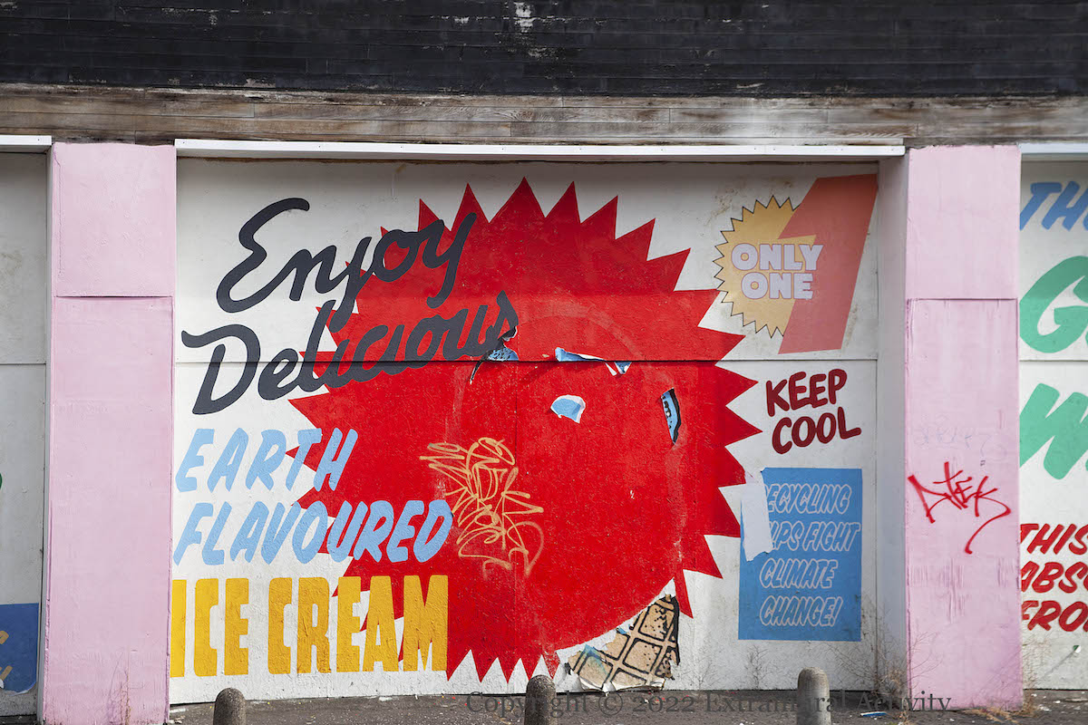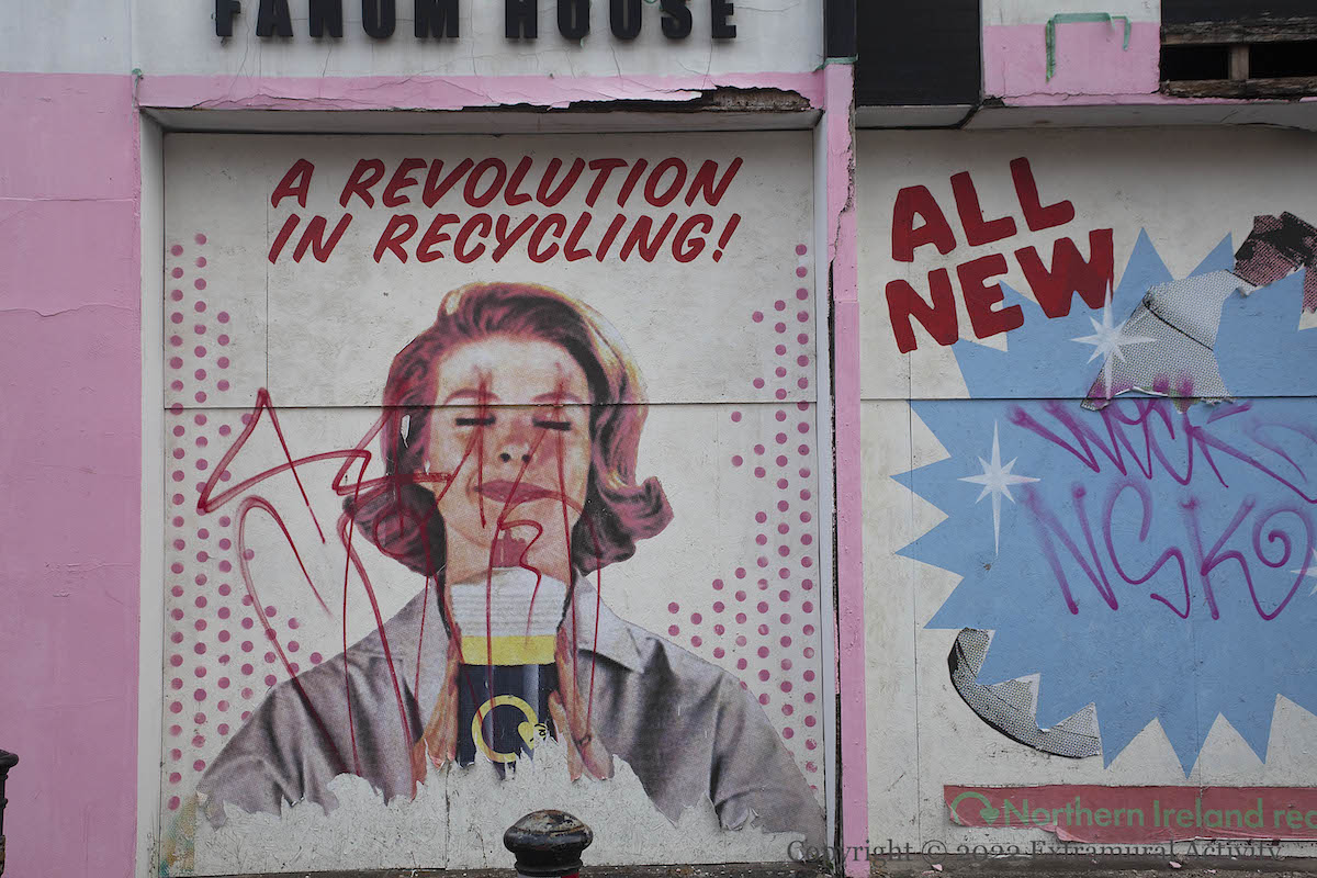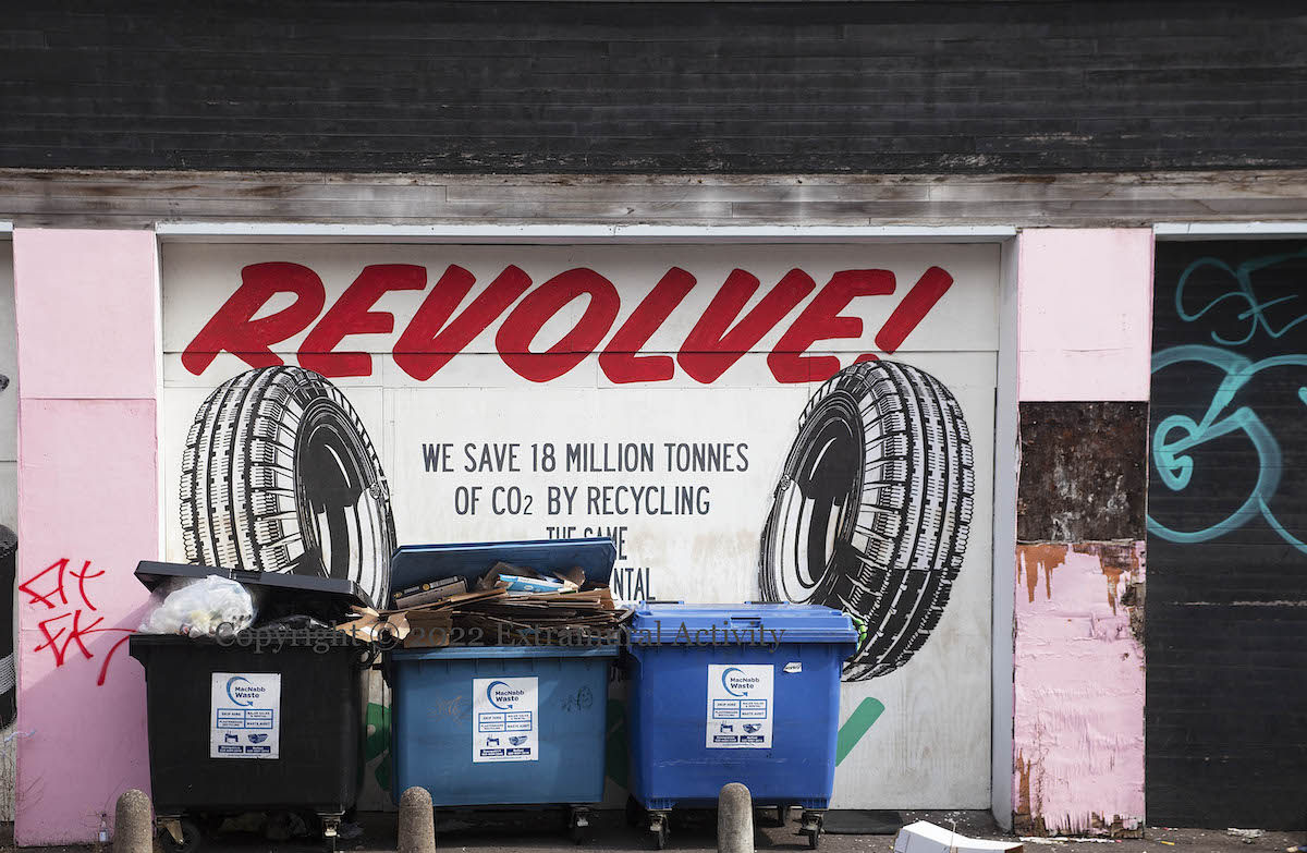 For Recycle Week 2021 (WRAP), Laura Nelson (ig) and Leo Boyd (web) installed a series of seven pieces (each a combination of sign-writing and paste-up) on Fanum House, using CO2-absorbing paint (from Graphenstone) and a potato-based glue for the paste-ups. “A revolution in recycling!”