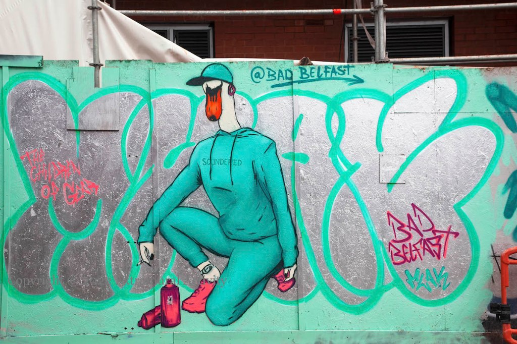 These are the murals from HTN22 in Kent Street above Union Street, by (in order) Hixxy (web), TMN krew, Rob Hilken (web), Curtis Hylton (web), Bad Belfast (ig) – punning on the Irish myth of the Children Of Lear.