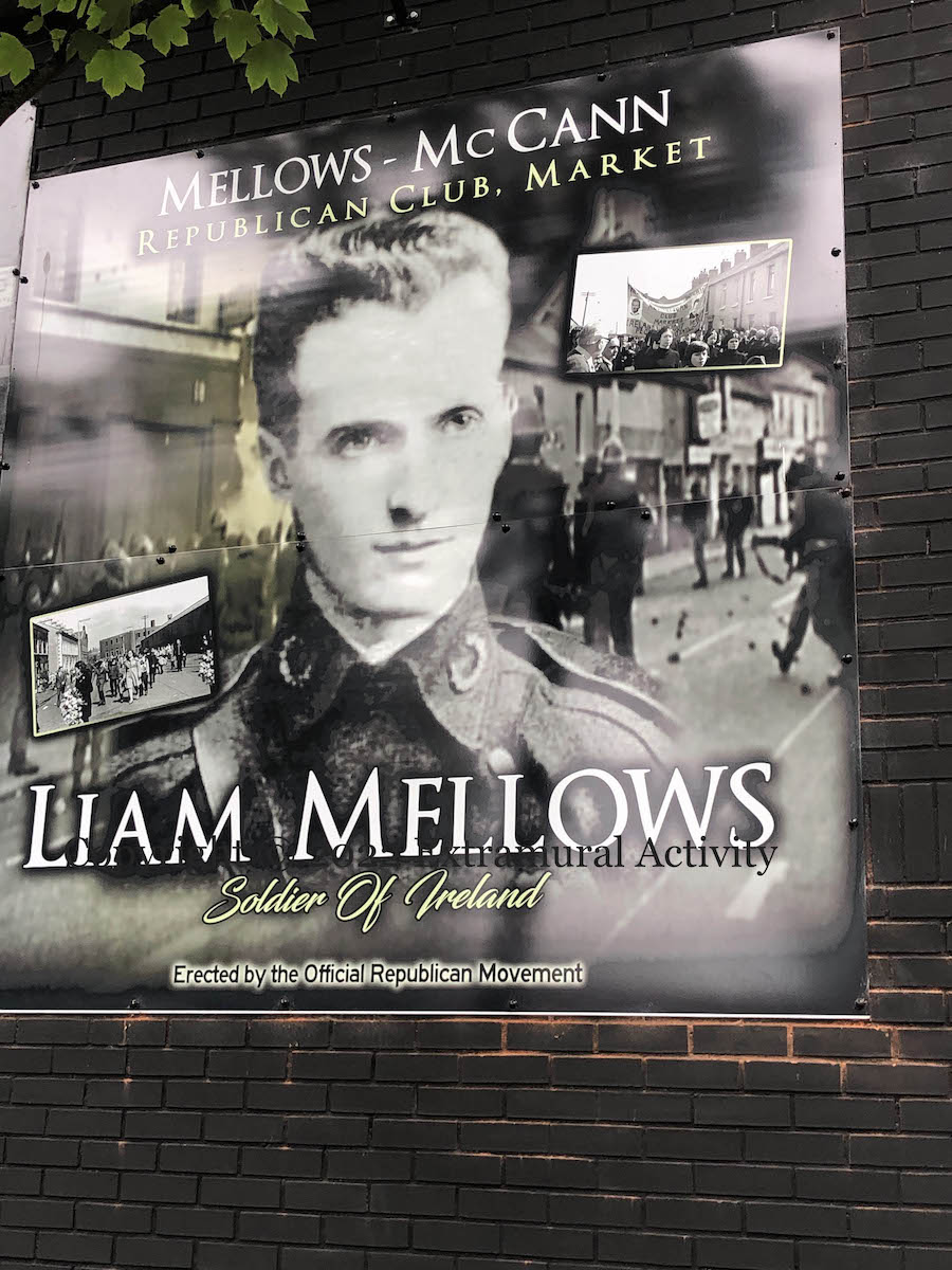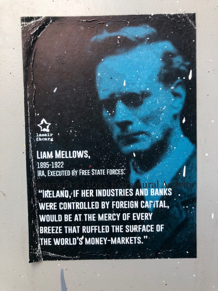 After serving in the IRA in the War Of Independence, Liam Mellows was elected to the First Dáil and as a member of the second Dáil voted against the Treaty in January 1922 (his speech is recorded in Oireachtas.ie under the name “Liam Mellowes”). In the Civil War that followed, he served as IRA quartermaster in the force in the Four Courts that surrendered to Free State forces on June 30th, 1922. He was imprisoned in Mountjoy and executed in December, in reprisal for the killing of Seán Hayes (see Executed). (WP | An Phoblacht) His proposals for government were published posthumously as ‘Mellows Testament’ (NLI) and include state ownership of heavy industry, large estates, the transport system, and the banks. The sticker below quotes from that document: “Ireland, if her industries and banks were controlled by foreign capital, would be at the mercy of every breeze that ruffled the surface of the world’s money-markets.”