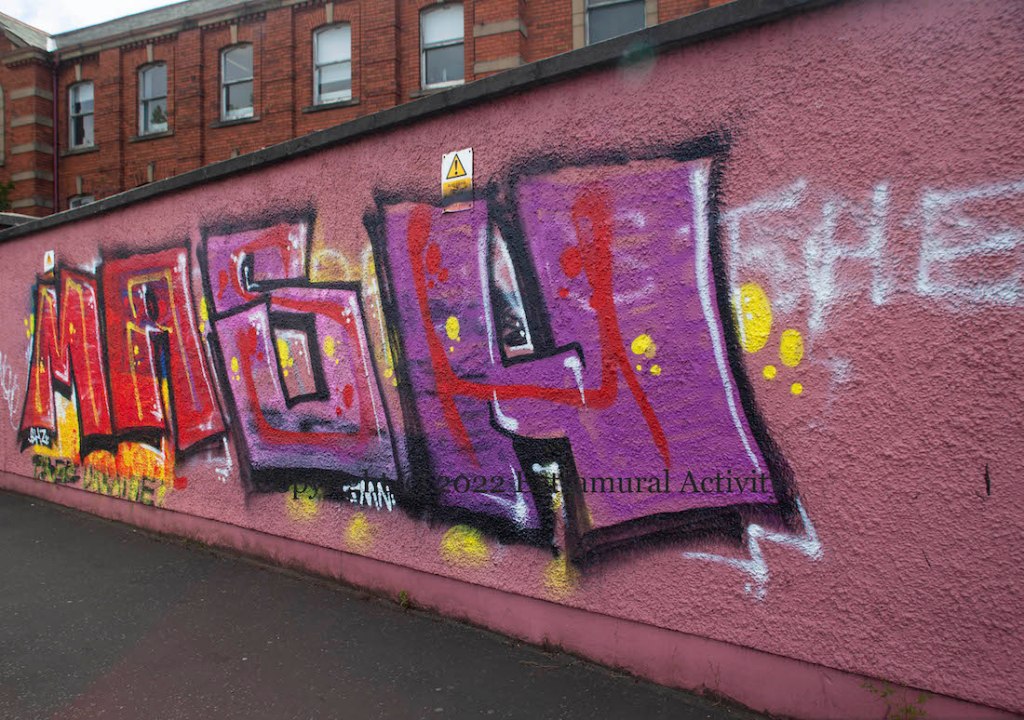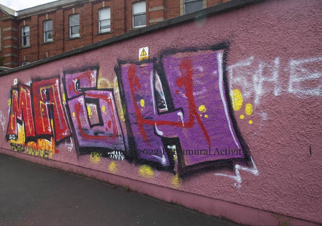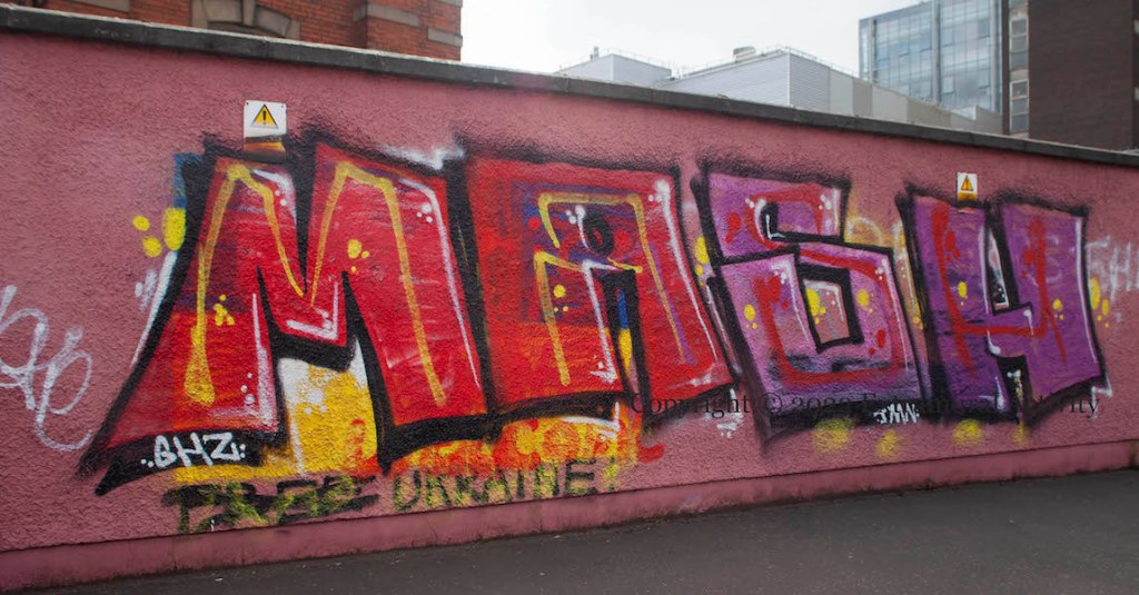 The Ireland Supports The People Of Donetsk graffiti outside the RVH has been modified, perhaps twice. Most prominent is a the writing by MASH (of TMN krew) – highly unusual appearance by a tagger on a central thoroughfare (and in west Belfast, too).