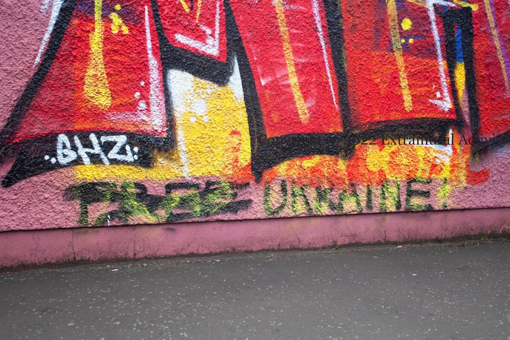 It is possible is that the “Free Ukraine” in the bottom left was an earlier response to the original graffiti. It is not clear why “Free” has been x-ed out.