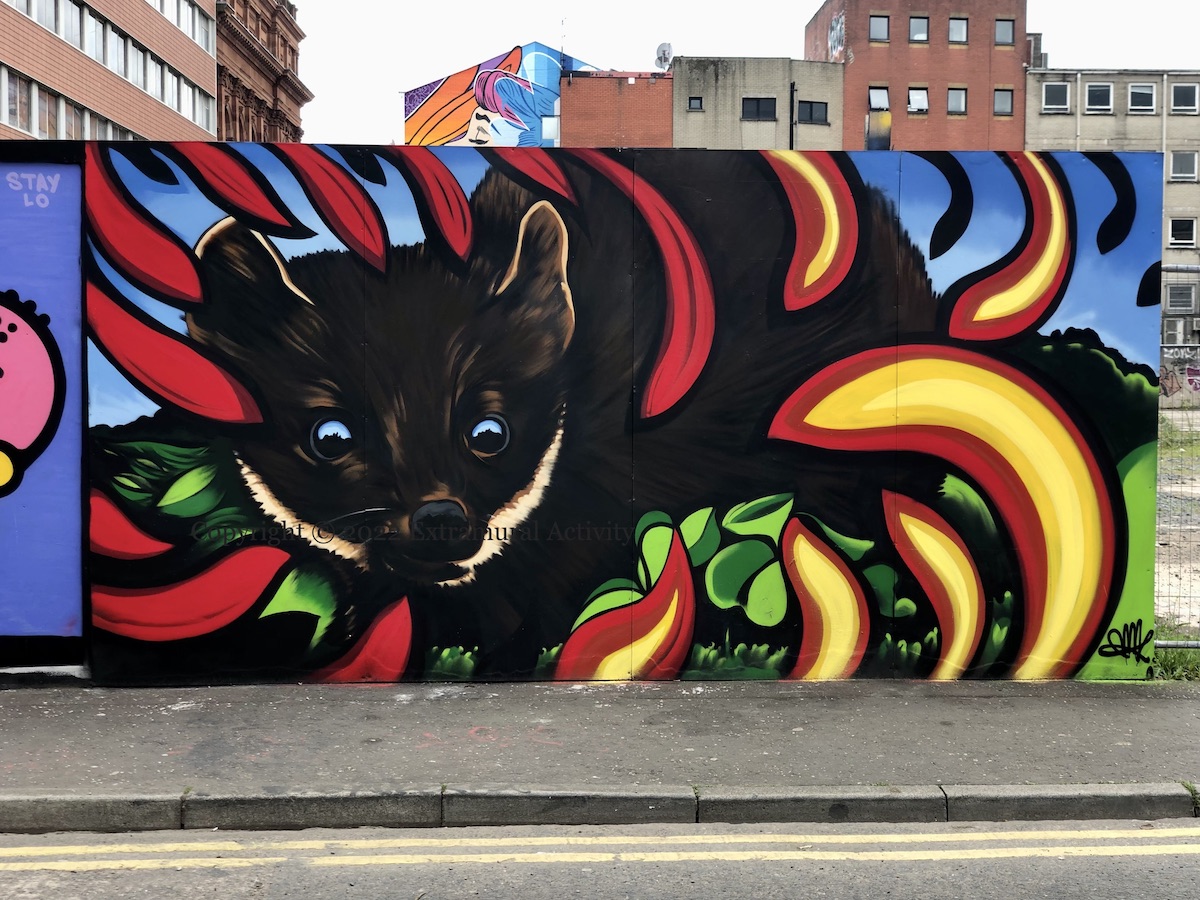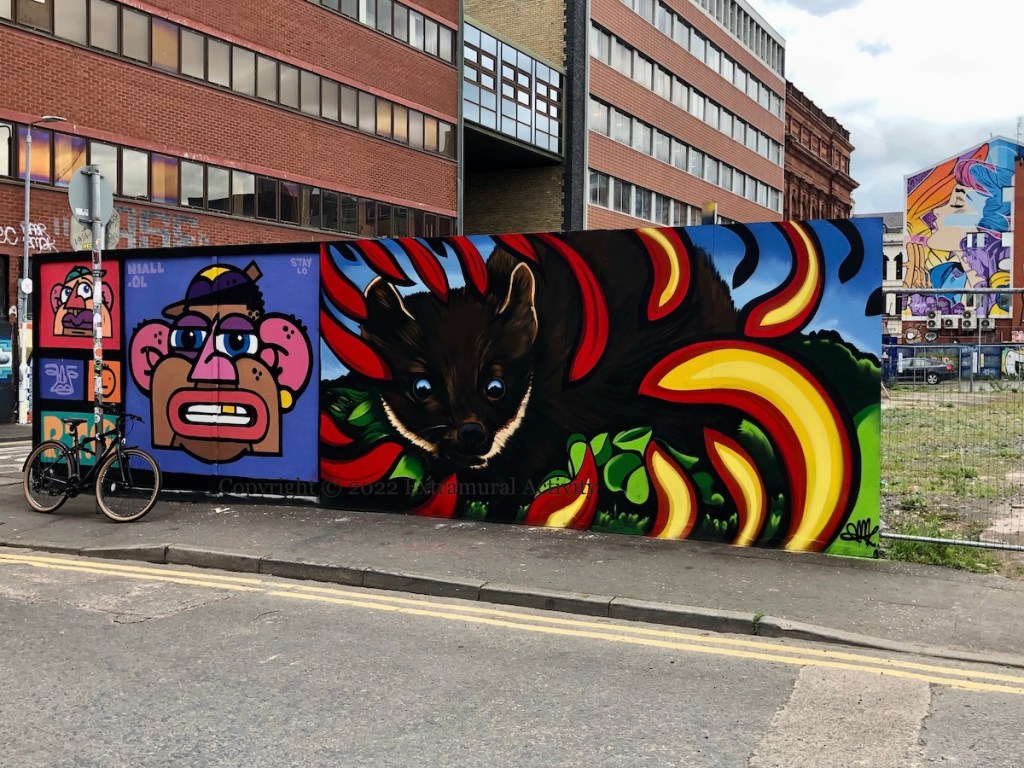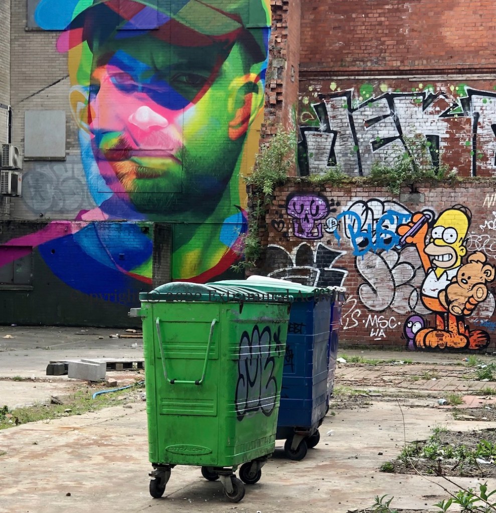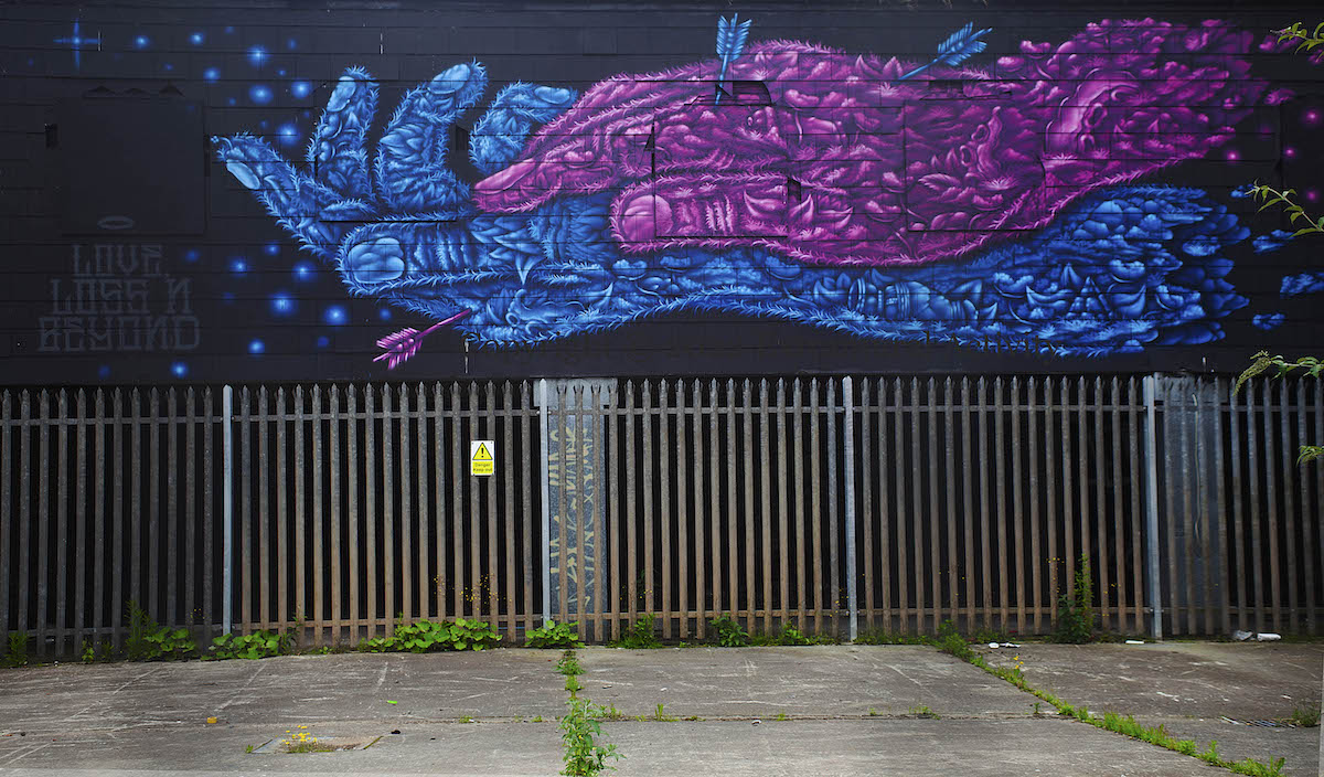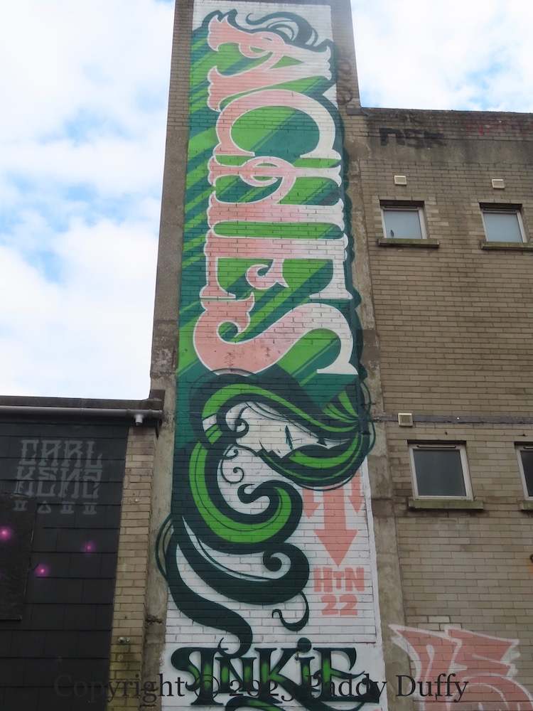 Here is the HTN22 street art and writing along Union Street, Belfast, west of Kent Street, in sequence from east to west. The pieces are by Nial.OL (ig), JMK (ig), Kenz (ig) (whose piece is entitled ‘Love, Loss, And Beyond’), KMG (ig), Inkie (ig), Aches (ig), and Homer Simpson with Garfield legs by Bust (ig) whose large piece can also be seen, in the background of the third image (and was featured previously in Belfast Or Bust).