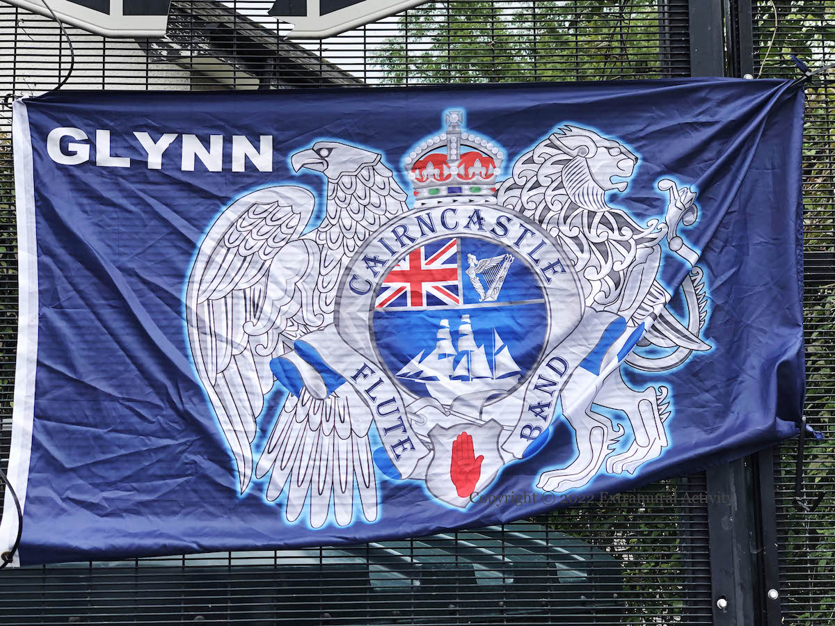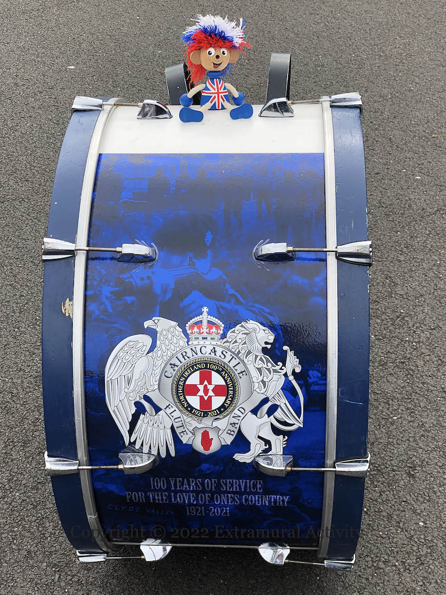 “100 years of service for the love of one’s country – 1921-2021.” Cairncastle flute band (Fb) marks the centenary of Northern Ireland and local military force with a special shell on one of their drums. The Special Constabulary was founded in 1920, in advance of partition and the creation of Northern Ireland (The Irish Story) and survived until 1970 when the UDR was established; this in turn became part of the RIR in 1992 and the RIR exists to this day.