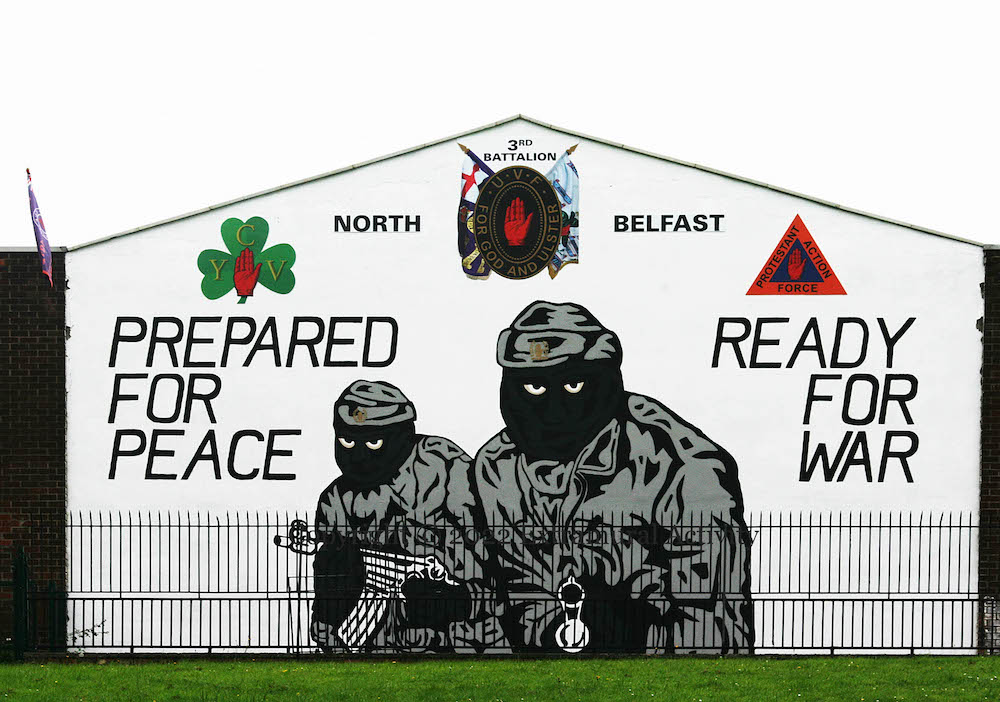 For this year’s Twelfth, the famous UVF “Prepared for peace, ready for war” mural that has stood over the entrance to Mount Vernon for twenty years was retouched. The most obvious change is in the apex, as a different UVF symbol – with flags – has been included, along with the words “3rd Battalion” which had been in the much earlier version of this mural on another wall.