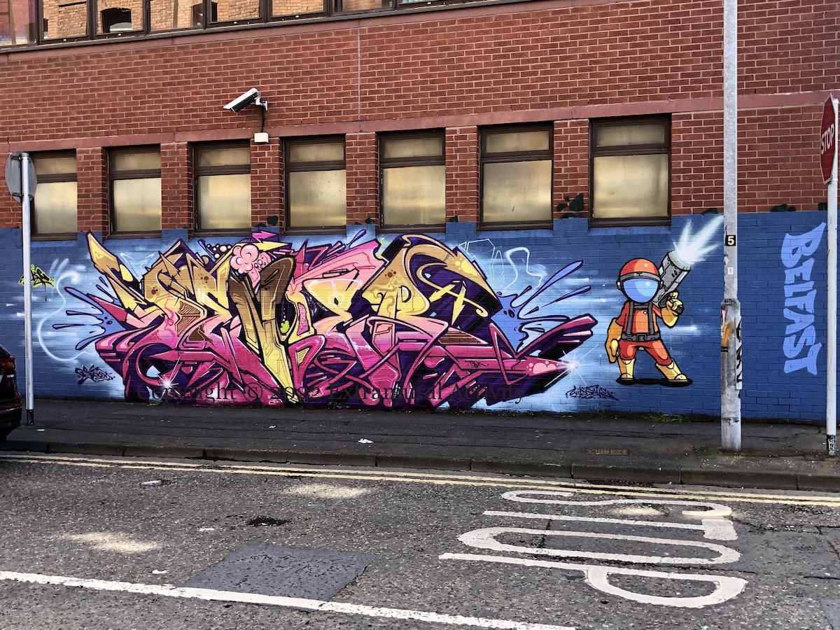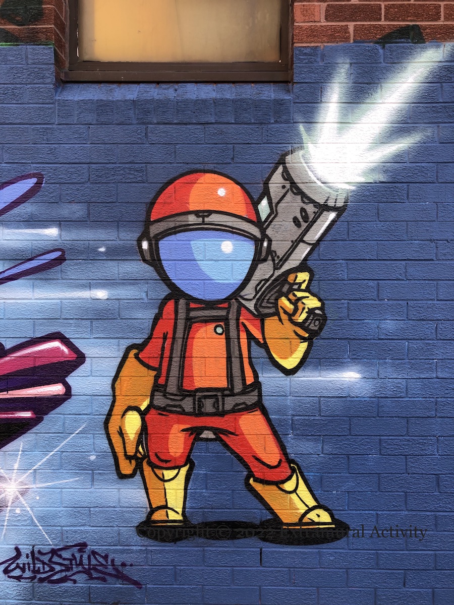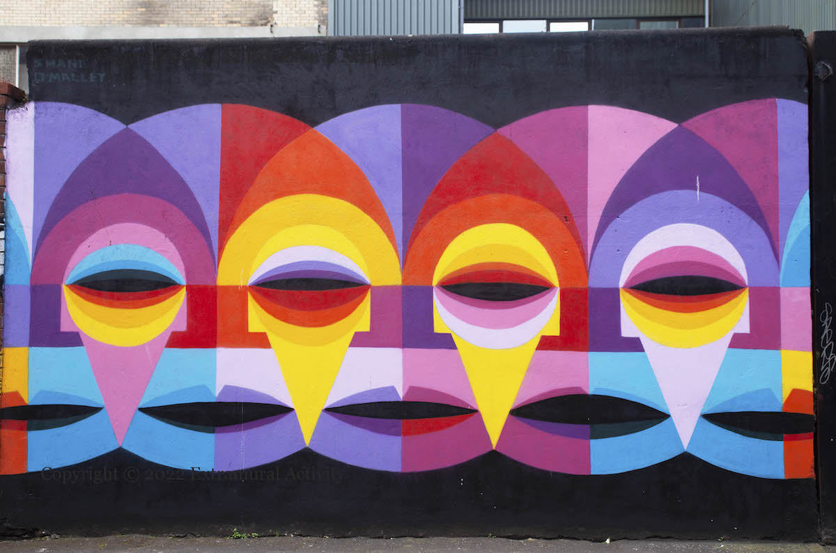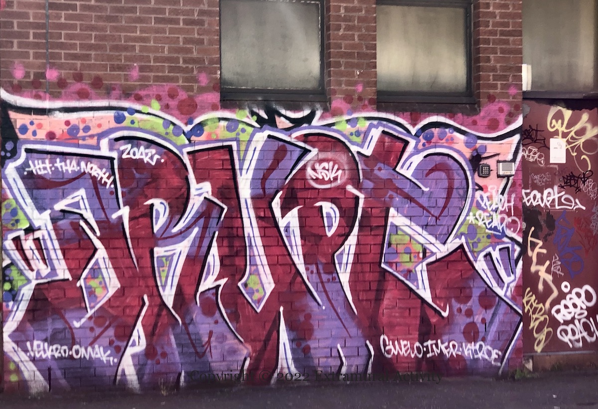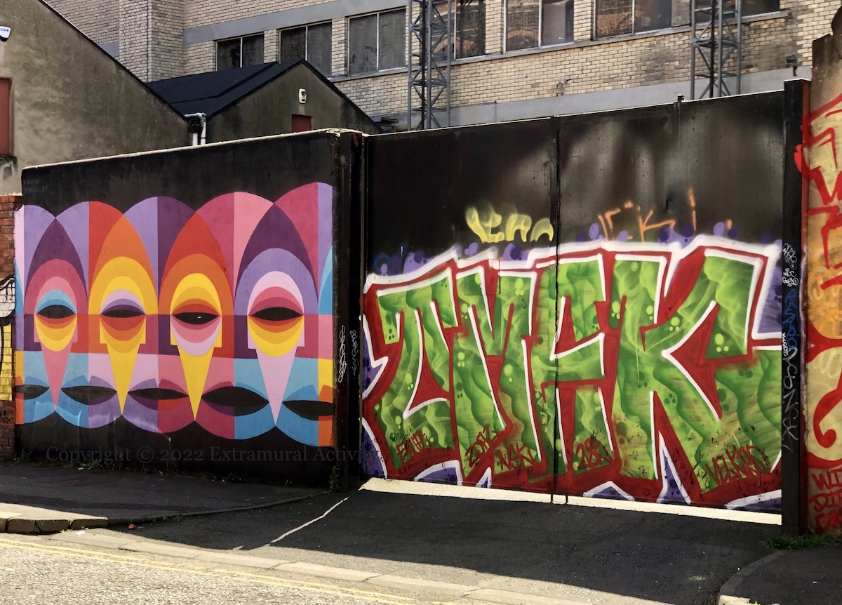 There’s no official title to this set of overlapping masks by Shane O’Malley for HTN22. Shane’s piece replaces One Love Louis’s ‘Monkey’ from 2015. The five new pieces of wild-style that are also on the west side of Library Street are included below.