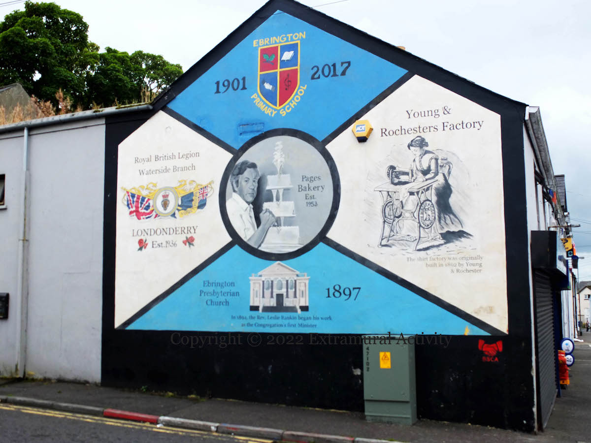 Although only Bond’s Place now retains the apostrophe, all of the “Bond” placenames in the Waterside (Bond’s Place, Bonds/Bond’s Street and Bonds/Bond’s Hill) are named after the Bond family, one of whom – William – was a United Irishman (Derry Journal). Bond’s Field is the site of the former Ebrington factory – home to Young & Rochesters shirt factory (Smart Tour) – and now part of the Ebrington complex (Scrivener). Four other Ebrington institutions are included in this Ebrington Street mural: Ebrington Primary school (web) which was originally at the end of Roulston Avenue, Ebrington Presbyterian (web), the Waterside branch of the Royal British Legion (Fb), and (in the centre) Pages bakery, which is now the Ebrington Bake House (Fb).