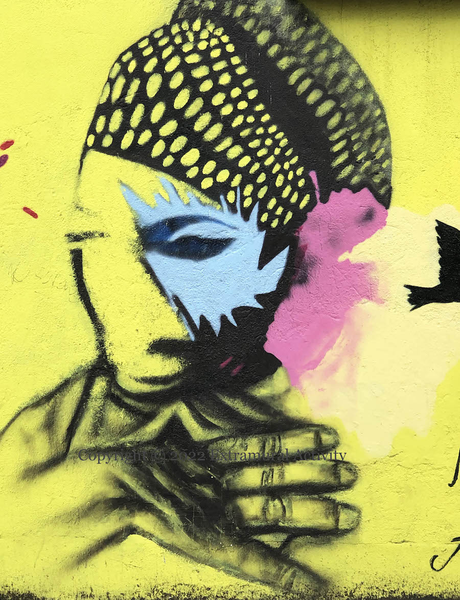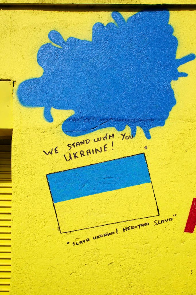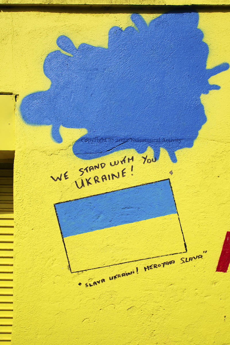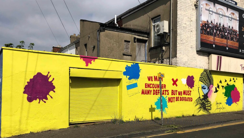 “… but we must not be defeated.” Racists graffiti was added to the Maya Angelou mural in Dundela Avenue shortly after it was painted last July (Belfast Live). The repairs got rid of the graffiti and restored the lettering but the face was not restored to its original condition. The mural has remained intact since then and the yellow background provides an ideal surface for the Ukrainian flag and words of support: “We stand with you, Ukraine!” and “Slava Ukraïni – heroyam slava! [Glory to Ukraine – to the heroes, glory!]”