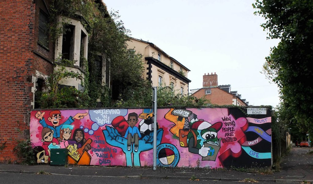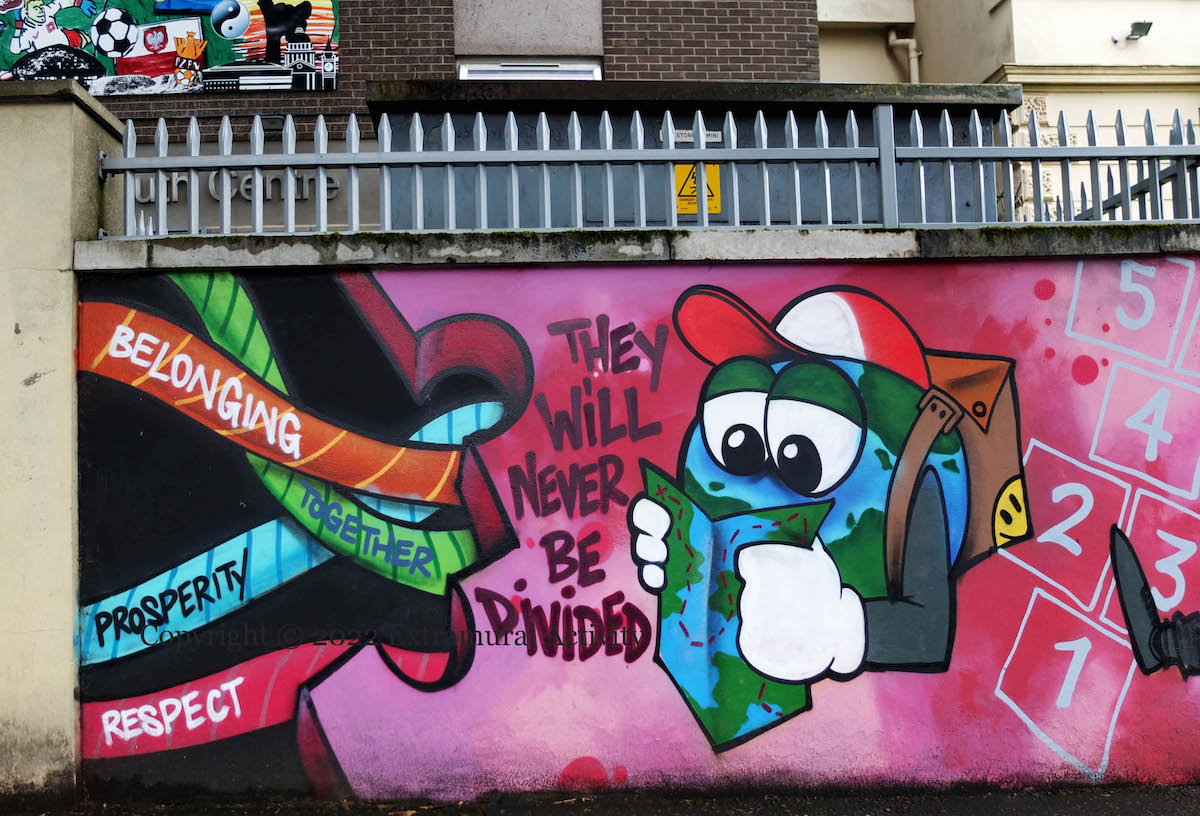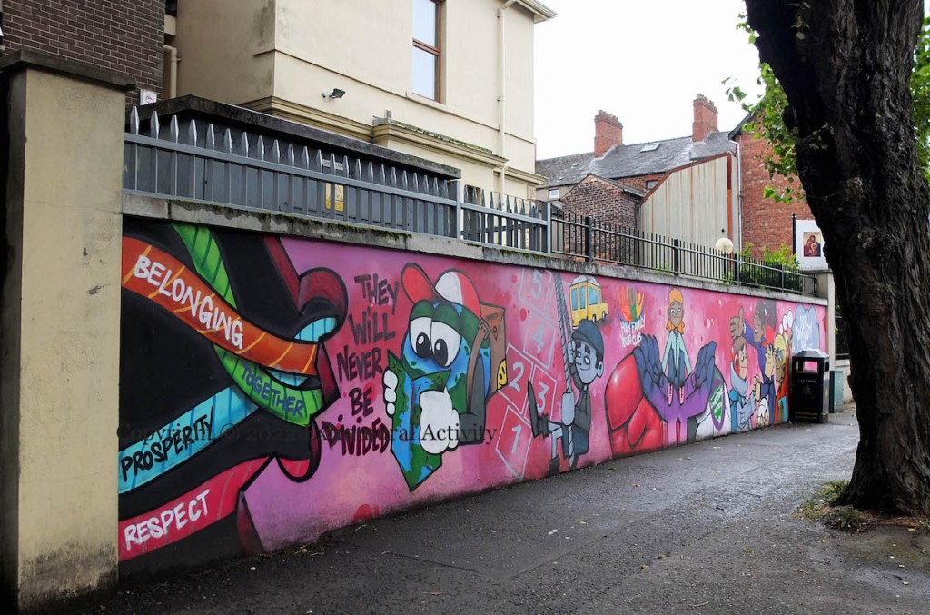 “… they can never be divided.” The two parts of this slogan are found at the end and the beginning of two murals and symbolically join together PUL Tiger’s Bay (with a mural at the end of the “peace” line on Hallidays Road, shown in the first three images) and CNR Newington (with a mural on Limestone Road, shown in subsequent images). Youths from both communities worked on the murals (Belfast Live).
