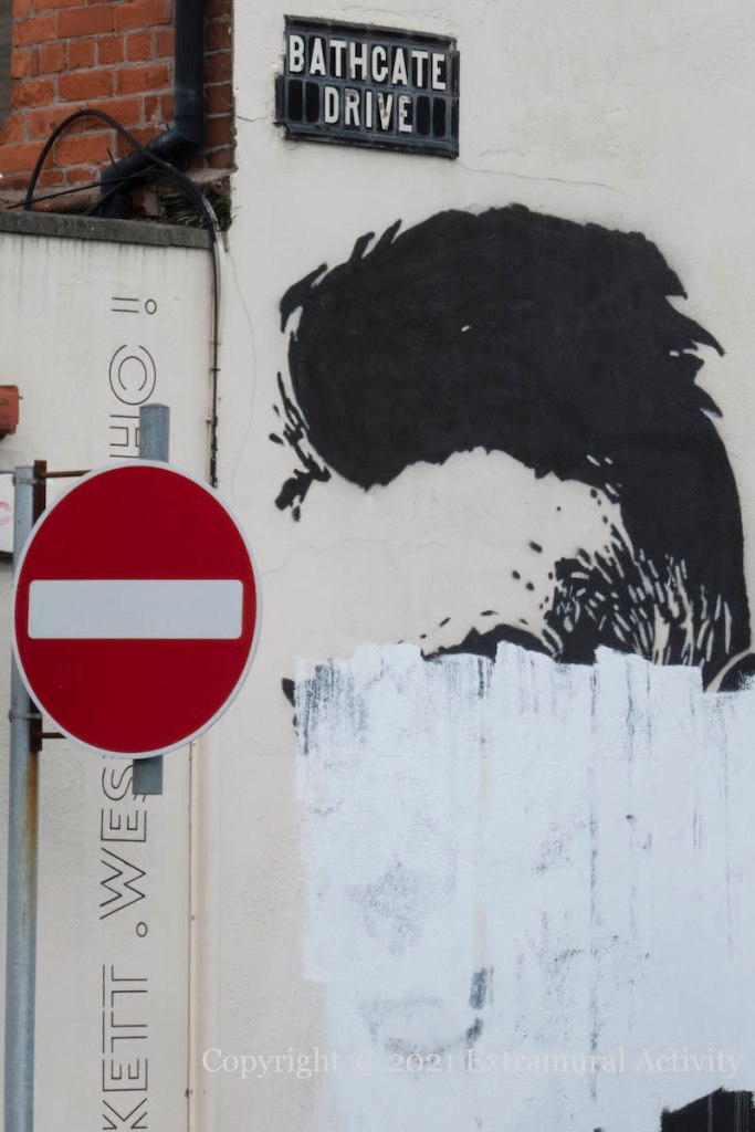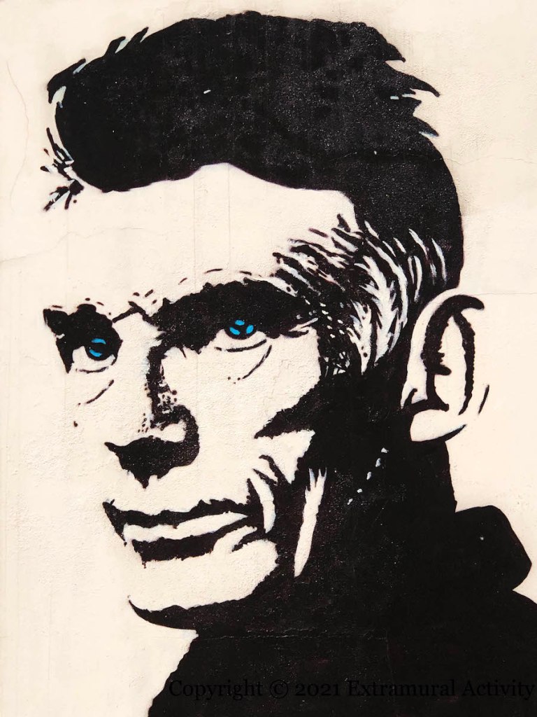 Glen Molloy’s Samuel Beckett mural in the Dundela area of east Belfast was largely whitewashed the day after it was finished – see the second image, below. (This was only a few weeks after the Maya Angelou mural across the street was painted and graffitied.) (Belfast Live) The portrait was restored last year, with blue sparkling blue eyes, and the quotation was added again this summer.