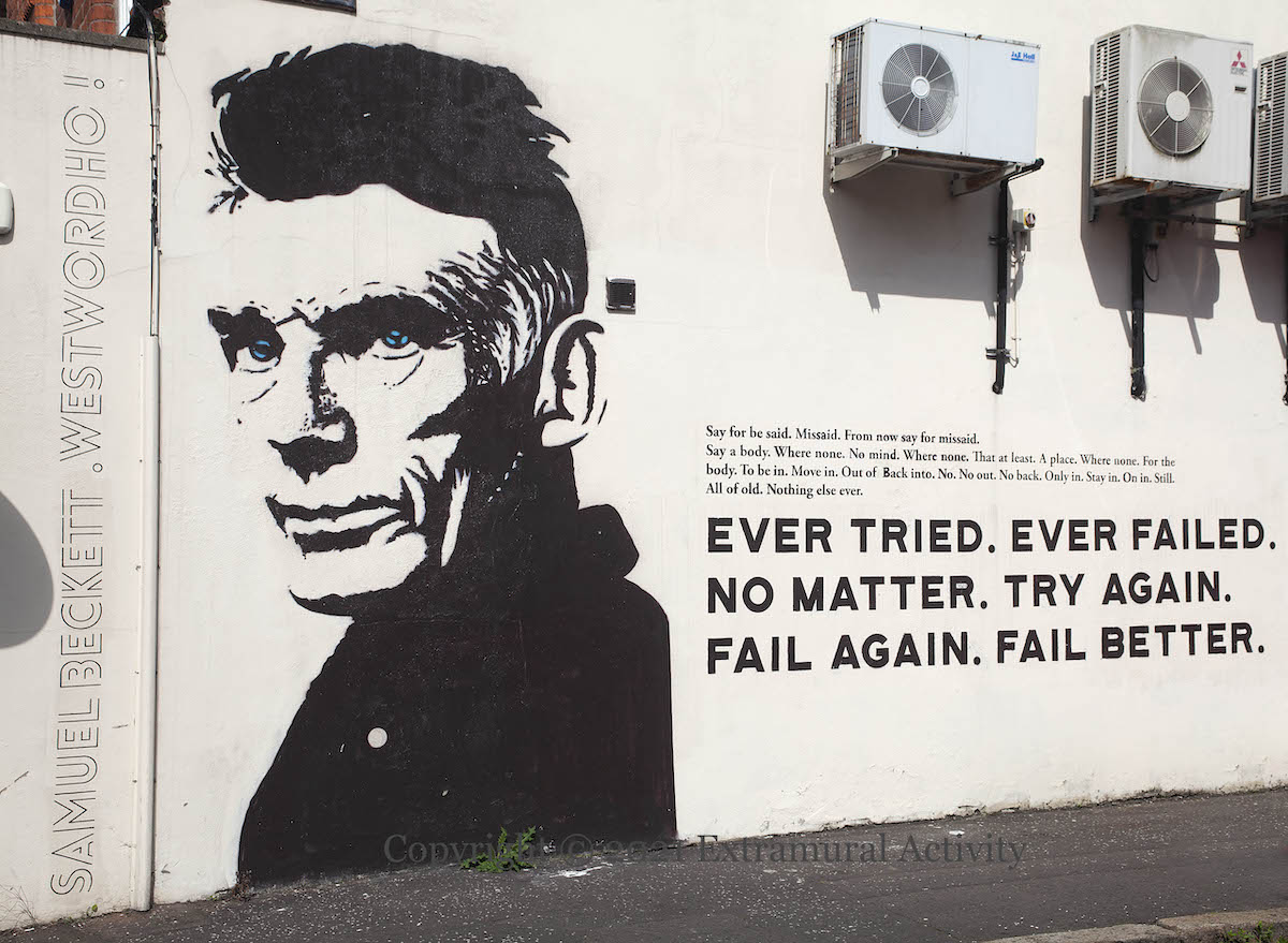 The quotation is from Worstward Ho! (not “Westword Ho!” as written on the wall): “Say for be said. Missaid. From now say for missaid. Say a body. Where none. No mind. Where none. That at least. A place. Where none. For the body. To be in. Move in. Out of. Back into. No. No out. No back. Only in. Stay in. On in. Still. All of old. Nothing else ever. Ever tried. Ever failed. No matter. Try again. Fail again. Fail better.”