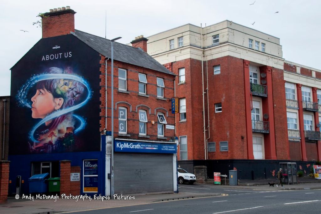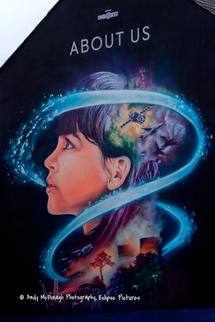 This is the mural painted by UVArts (web) to accompany the About Us film exhibition that visited London-/Derry in March, showing life from the Big Bang until the present day, commissioned by Unboxed.
