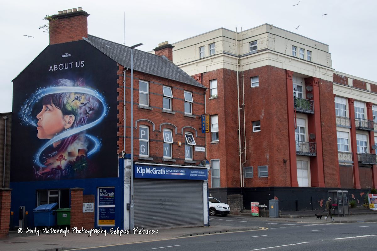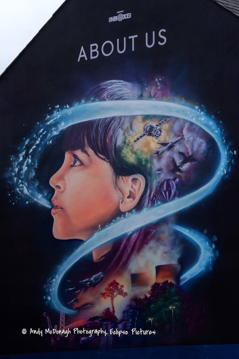 This is the mural painted by UVArts (web) to accompany the About Us film exhibition that visited London-/Derry in March, showing life from the Big Bang until the present day, commissioned by Unboxed.