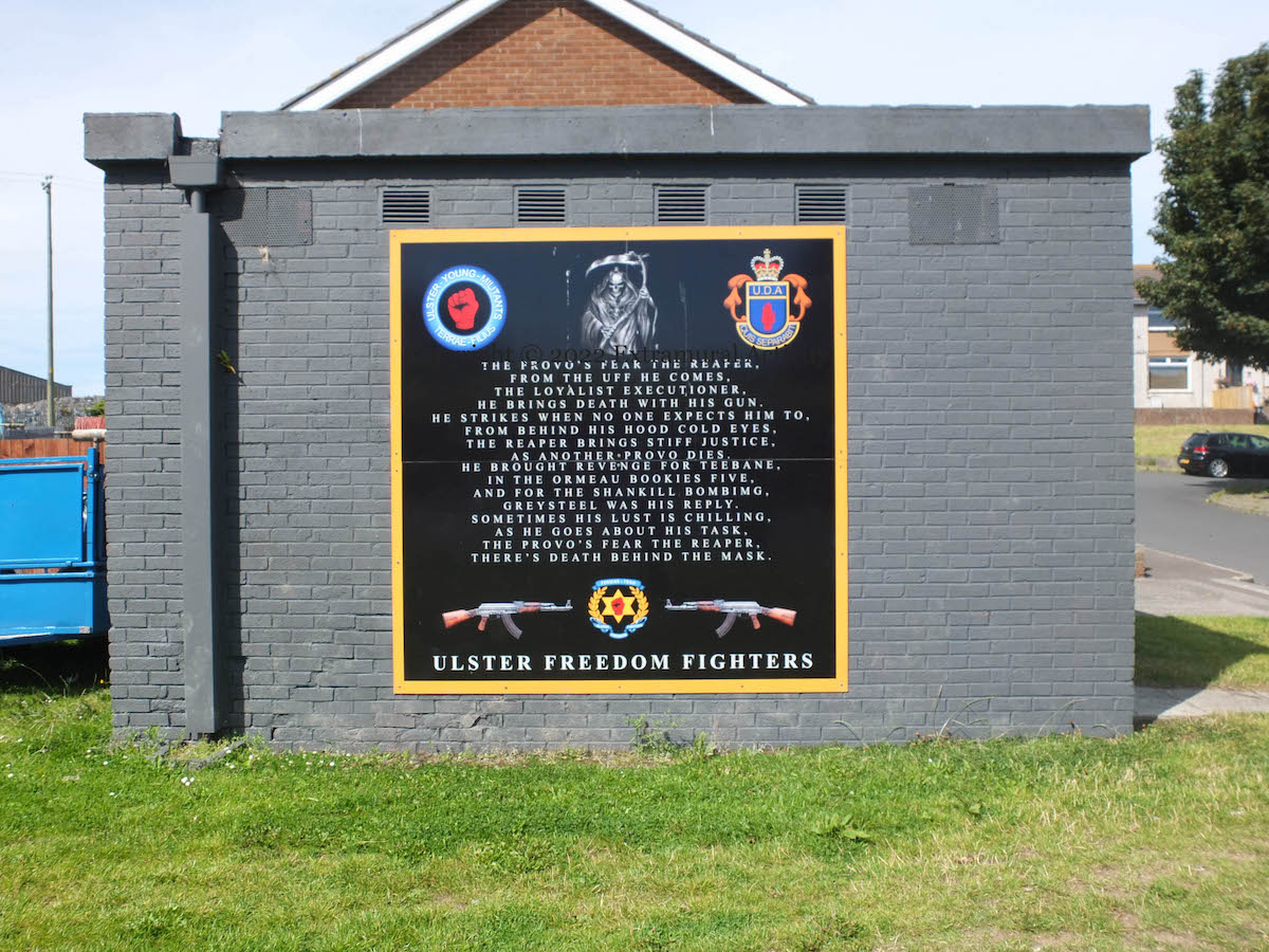 In Eddie The Trooper murals, the reaper typically follows behind to collect the bodies. But lately he has been stepping into the limelight by himself, accompanied by a poem of terror (similar to the poem in The Reaper Come To Call): “The Provo’s fear the reaper/From the UFF he comes/The loyalist executioner/He brings death with his gun/He strikes when no one expects him to/From behind his hood cold eyes/The reaper brings stiff justice/As another Provo dies/He brought revenge for Teebane/In the Ormeau bookies five/And for the Shankill bombing/Greysteel was his reply/Sometimes his lust is chilling/As he goes about his task/The Provo’s fear the reaper/There’s death behind the mask”