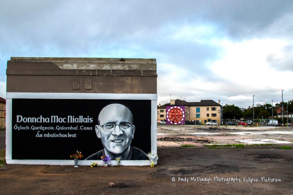 “Óglach, gaeılgeoır, gníomhaí, Cara. Ár mbuíochas leat. [Volunteer (in the IRA), Irish-speaker, activist, friend. Our thanks to you]” Mac Nıallaıs was imprisoned in 1976 (Belfast Telegraph) and went on the blanket – here is his mother, Mary, protesting his treatment: Do You Care? Upon his release in 1986 he took up community work and political activism in Derry, including a prominent role the parade protests in the mid-90s (see No Sectarian Marches | No Consent No Parade). (Derry Journal) The mural is by local artists Razer and (Donncha’s brother) Paddy Nelis (BelTel).